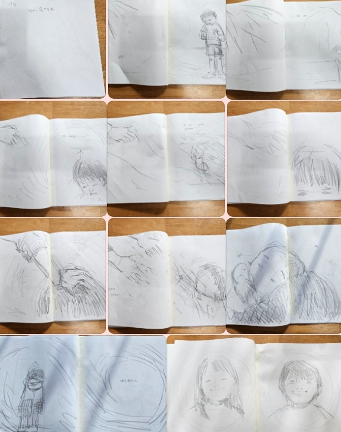 어떤 분은 목탄을 선호하기도 하였고, 어떤 분은 색연필을, 또 어떤 분은 오일파스텔을 선호하기도 하였다. 하지만 채색도 채색이겠지만 가장 급한 것은 스케치였다. 스토리 보드에 들어간 그림들은 그저 실루엣이나 그림의 배치 등을 보는 용으로 한 것이기에 본격적인 스케치와는 또 다른 결이었다.