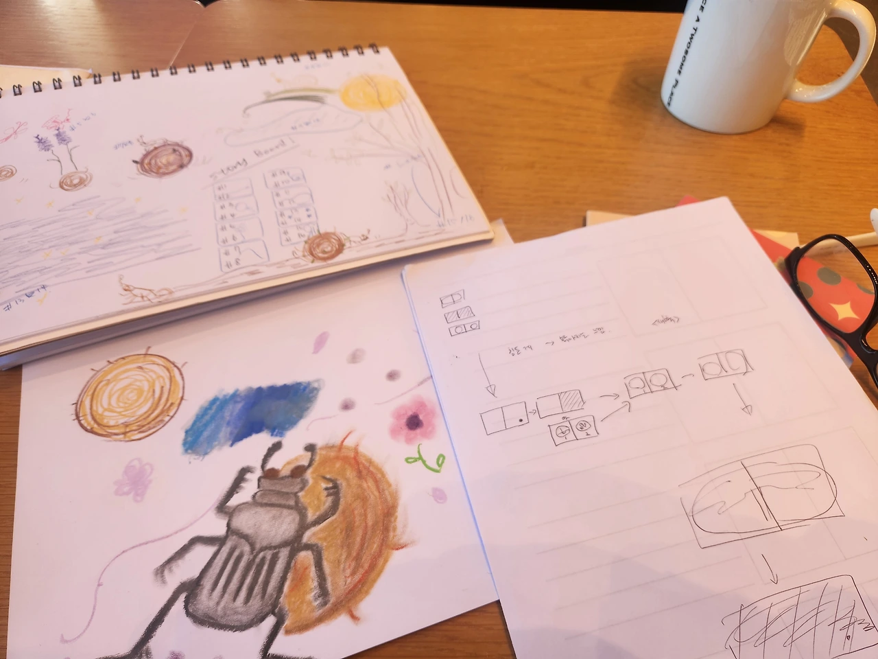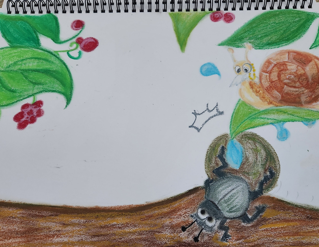 밑그림을 깨끗이 지우고 채색을 하다가 소똥구리 다리 하나가 뭉그러졌다.ㅠ 이 부분을 정리하느라 꽤 고생을 했다. 이 당시. 오일 파스텔의 특징을 제대로 파악하지 못한채로 작업을 해서 색감과 명암등이 어눌하다.