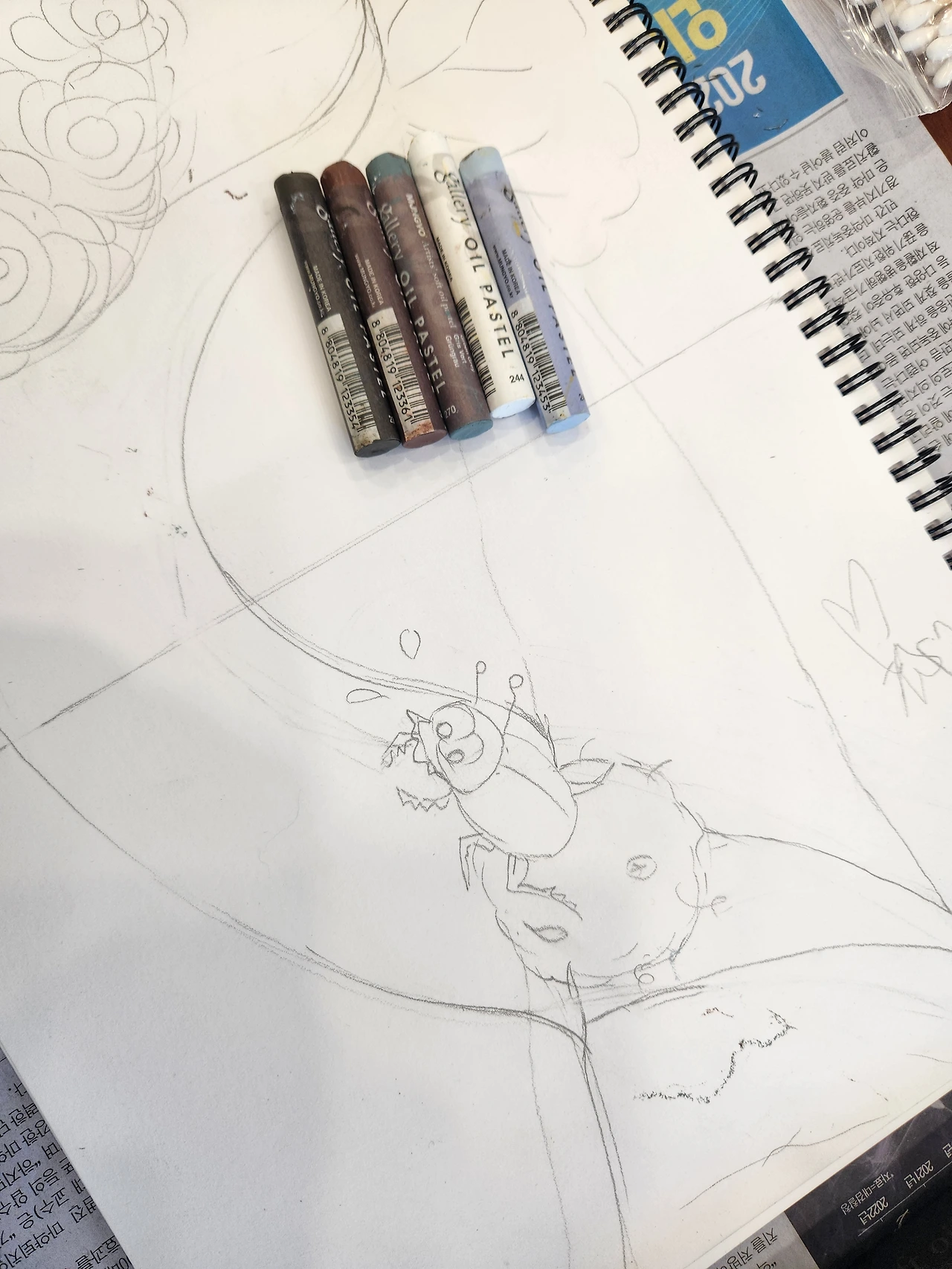 끙끙 마음속으로 고민을 하는 것을 보았는지 다겸회원님께서 오일파스텔을 사용해 보라고 권해주셨다. 실상 오일파스텔은 한 번도 해본 적이 없다. 하지만 다겸회원님의 오일파스텔을 빌려 테스트를 해보니 매력적이였다.