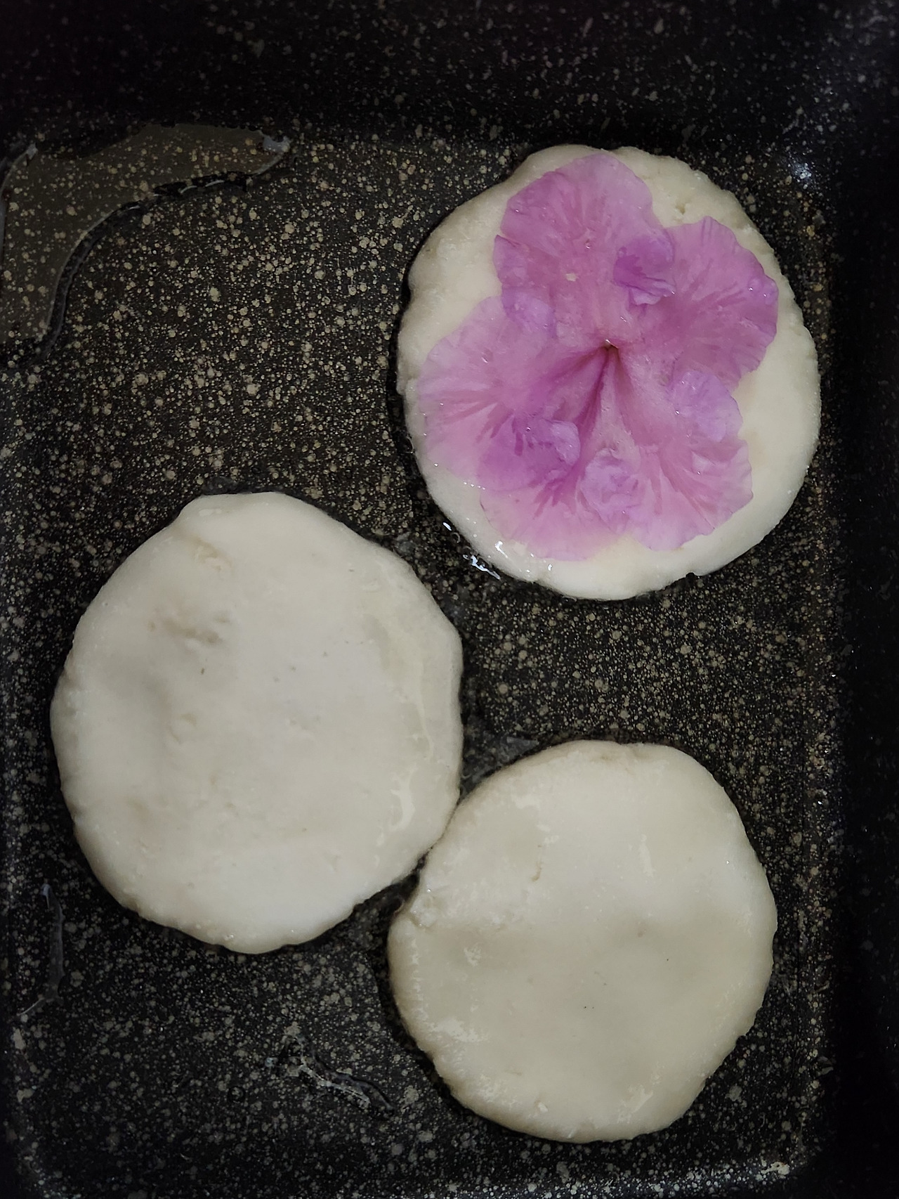 찹쌀가루를 익반죽을 한 뒤 납작하게 전을 부치기