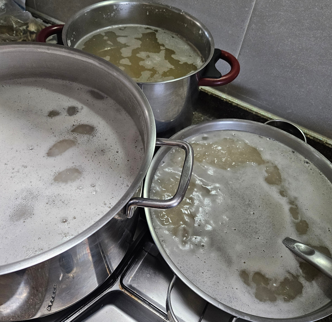 4) 찜통에 남아있는 엿기름물과 전기밥솥에 식혜물을 함께 넣어 절반으로 줄어들게 끊여 식혀 준다.