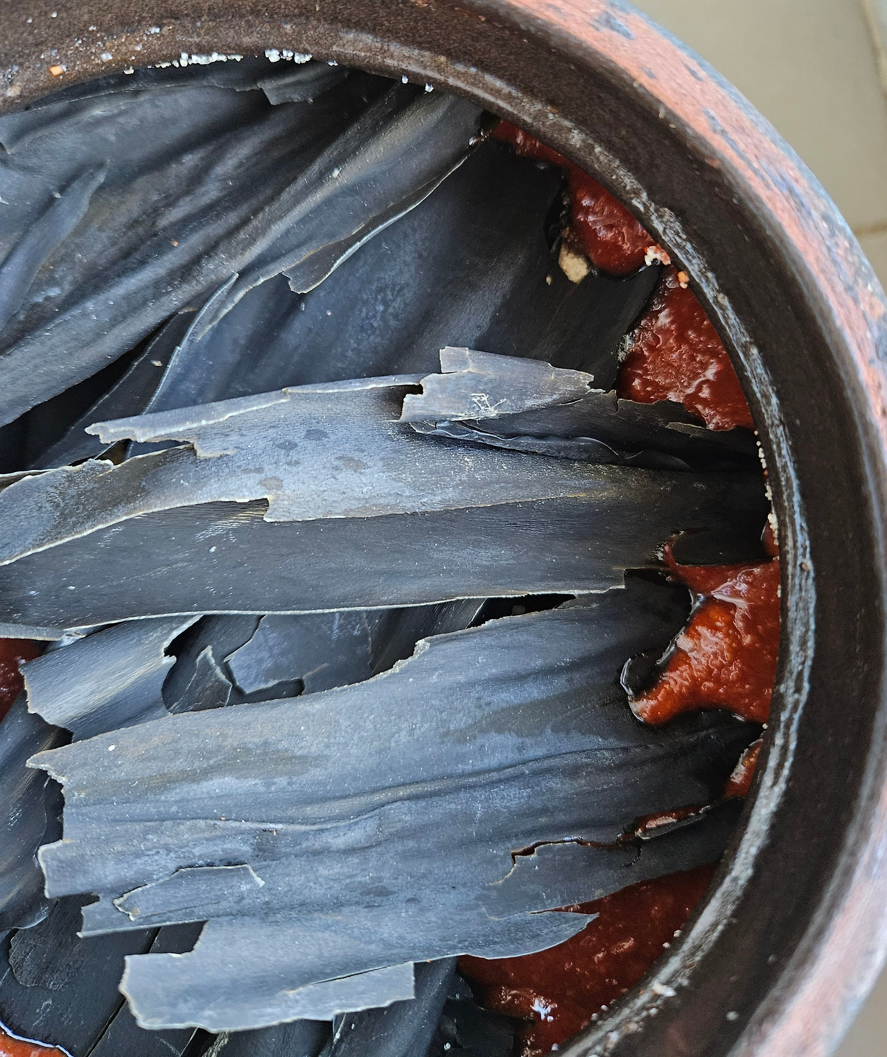 & 고추장 용기 위에 다시마를 덮어 주면 감칠맛이 천연조미료 역할도 해주고 습도 조절에 천연방부제로 곰팡이가 생기는 것도 방지해 준다.