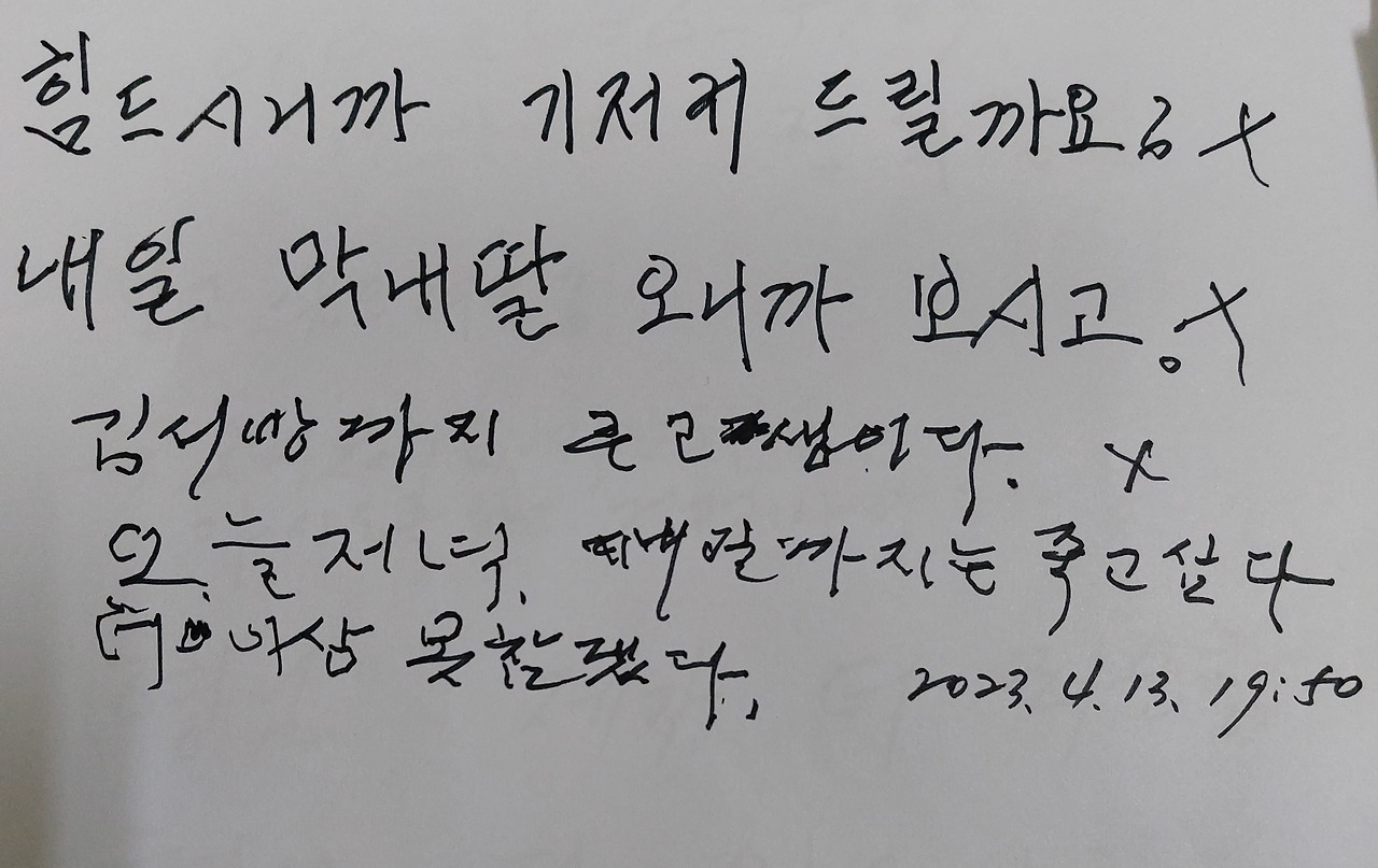 집에서 사망 시, 119에 신고하면 형사들이 먼저 와서 자연사인지 타살인지 구분하고 사진을 찍었다. 연세가 있으시지만 담당 형사로서 해야 할 일이라며 단서가 될만한 걸 물었다. 아버지와 주고받은 쪽지를 보여줬다.