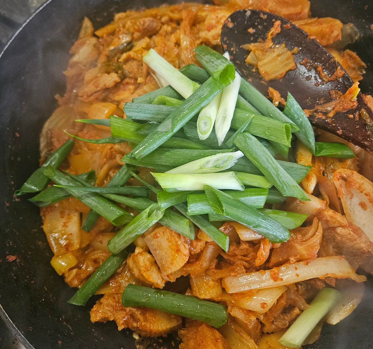 2) 적당히 볶아지면 뚜껑을 열고 양파와 마늘을 넣어 볶다가 대파, 참깨로 마무리한다.