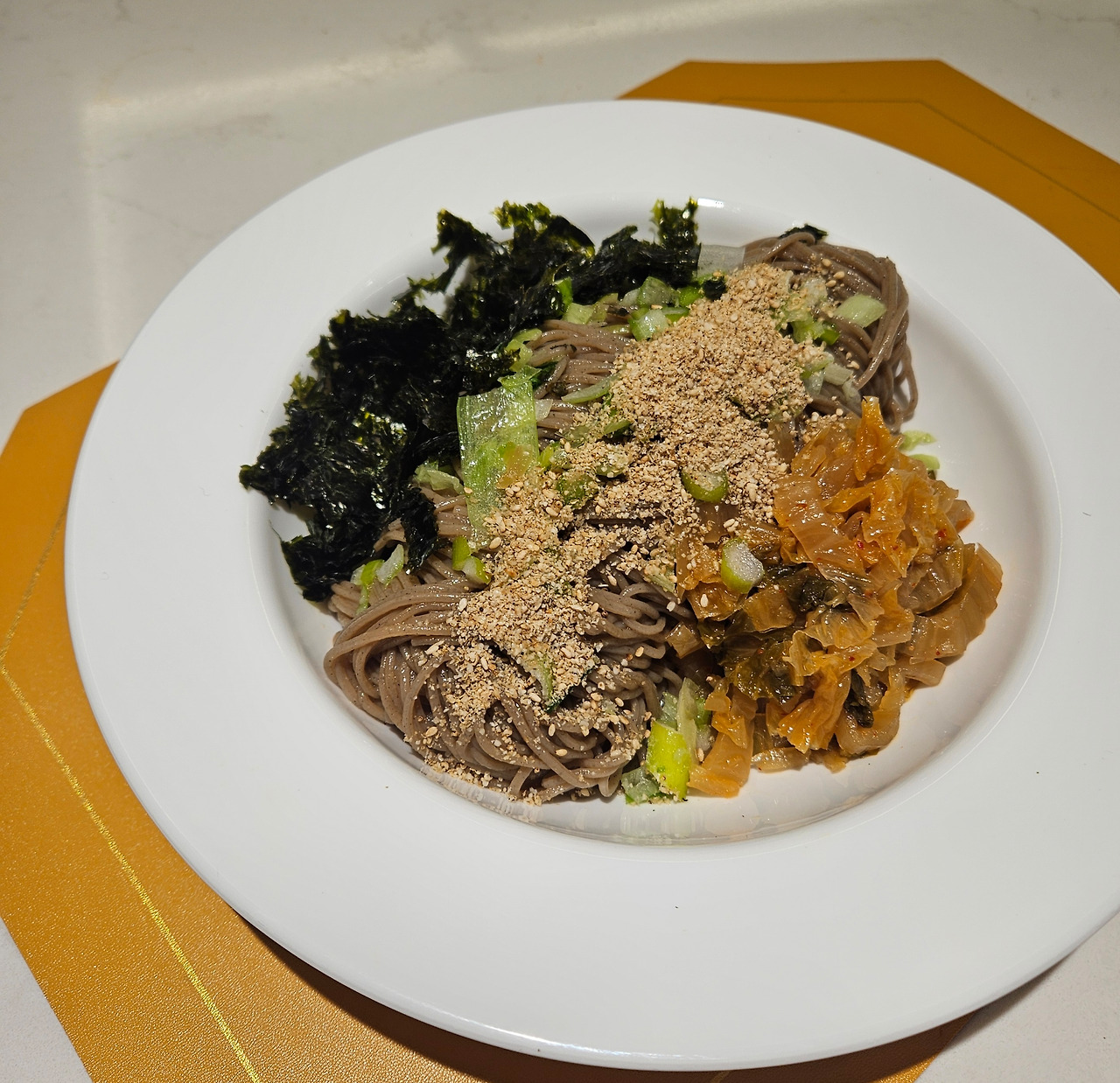 5) 삶아놓은 메밀국수에 양념장을 넣고 버무려 그릇에 담은 후, 묵은 김치, 파, 참깨를 고명으로 올려주면 끝.