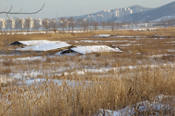 '하루 밤만에' 헐린 소금창고의 잔해들. 멀리 빼곡하게 아파트의 대군이 쓰러진 소금창고를 덮칠 듯 바라보고 있었다.