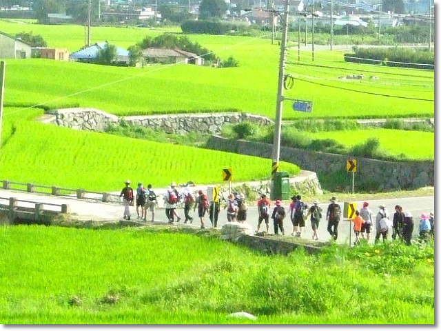 33도. 무더위가 아스팔트 길가를 끓게 하고 있다. 일행 중 중학생, 초등학생도 있다. 잘도 걷는다. 물어보니 초등생 2명은 남매인데 처음 일주일간은 힘들어하며 집에 가자고 엄마에게 졸랐다고 한다. 그러나 일행들 칭찬과 격려의 힘과 관심이 그들 남매를 일주일 만에 만만치 않은 길꾼으로 키워내고 있었다. 초등생 2학년과 4학년 아이들이 350여 km를 걷다니!