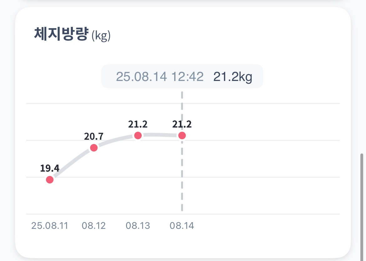 다음 사진은 월요일의 결과다. 확실히 살이 찐 것은 맞다. 지속적인 결과가 반복해서 나오고 있다.