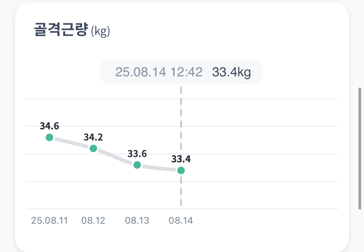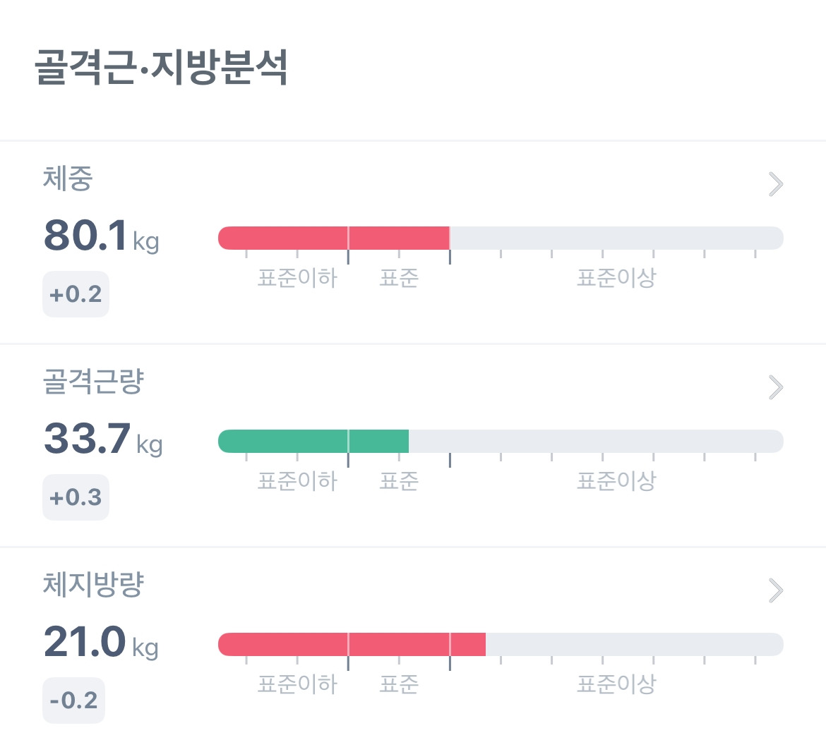 주말 이후 인바디 결과다. 몸의 수분량에 따른 오차도 분명히 존재하겠지만, 그걸 감안하더라도 좋은 결과는 아니다. 체지방 1.8kg이 증가했고 골격근이 1.2kg 감소했다. 물론 4일 동안의 변화라고 하기에는 급격한 면이 있긴 하다.