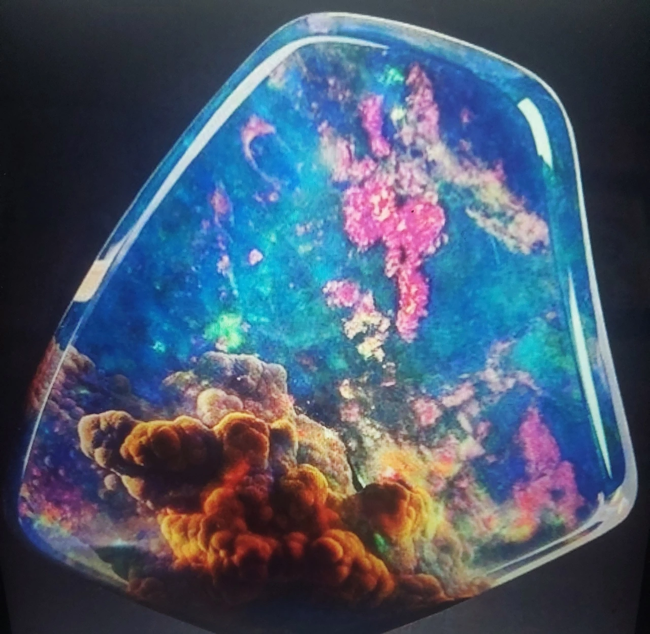 번갯불에 맞은 섬광이 들어갔을까 눈부시게 아름다운 유색효과는 상상할 수 없는 신의 영역인가 오로라보다 무지개보다 더 아름다운 오팔의 세계여 빨 주 노 초 파 남 보 핑크여 내 눈망울에 보이는 아름다운 오팔의 색상이 너무 많아 혼돈의 별이 되어 하롱하롱 설명할 수 없는 아름다운 수많은 색이여! 질투의 신이 뿌린 아름다운 은하의 별이 오팔 속에 숨었을까? 바닷속에 펼쳐지는 아름다운 별들이 오팔로 들어가 바닷속 생물의 신비로움을보여주고 있다 ( 김은심 시)