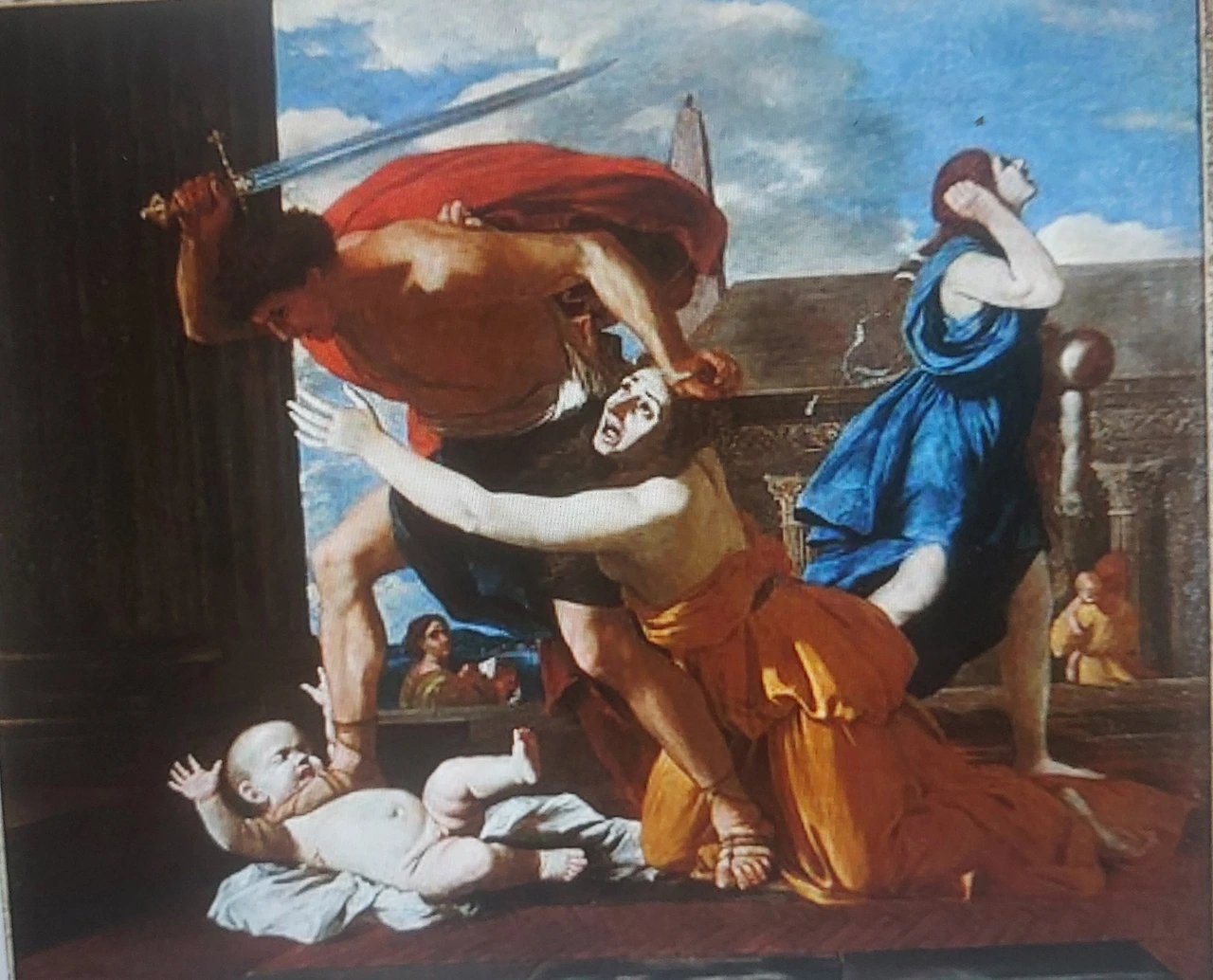 프랑스 화가 니콜라 푸생 화가의 그림을 보자 이 작품은 19세기 까지는 인기가 없다가 20세기 피카소의 "게르니카"를 크게 끼쳤다 푸생의 작품 중 유명한 작품이다 현재 "샹티이" 프랑스 콩데 미술관에서 볼 수 있다 필자가 세계여행 중 방문한 샹티이 성은 콩데 성으로도 불린다 미술관 내부에는 파리 루브르 박물관에 회화처럼 수준 높은 성화와 일반작품도 많다 헤롯 왕에게 무차별 학살당하는 아기들은 눈뜨고 볼 수 없는 헤롯왕의 불안한 옥좌를 지키려는 욕망에서 비롯된 것이다 박사들에게 속은 것을 알고 <마태복음 2:16절> 그때를 기준하여 두 살부터 그 아래로 다 죽이니라.... 동방박사 세 사람이 헤롯왕을 찾아간다 유대인의 왕이 나신이가 어디서 나셨느냐고 물었을 때부터 헤롯왕은 제거하기로 마음먹었다 푸생은 이 그림에서 아기를 죽이려는 남자와 살인을 막으려고 절규하는 어머니를 중점으로 그렸다 인류는 계속되는 희생과, 전쟁의 소용돌이를 그쳐야 한다 <푸틴이 경제책사로 국방장관을 바꾸어서 전쟁의 흐름이 끝나려나.... 박성진 시인>