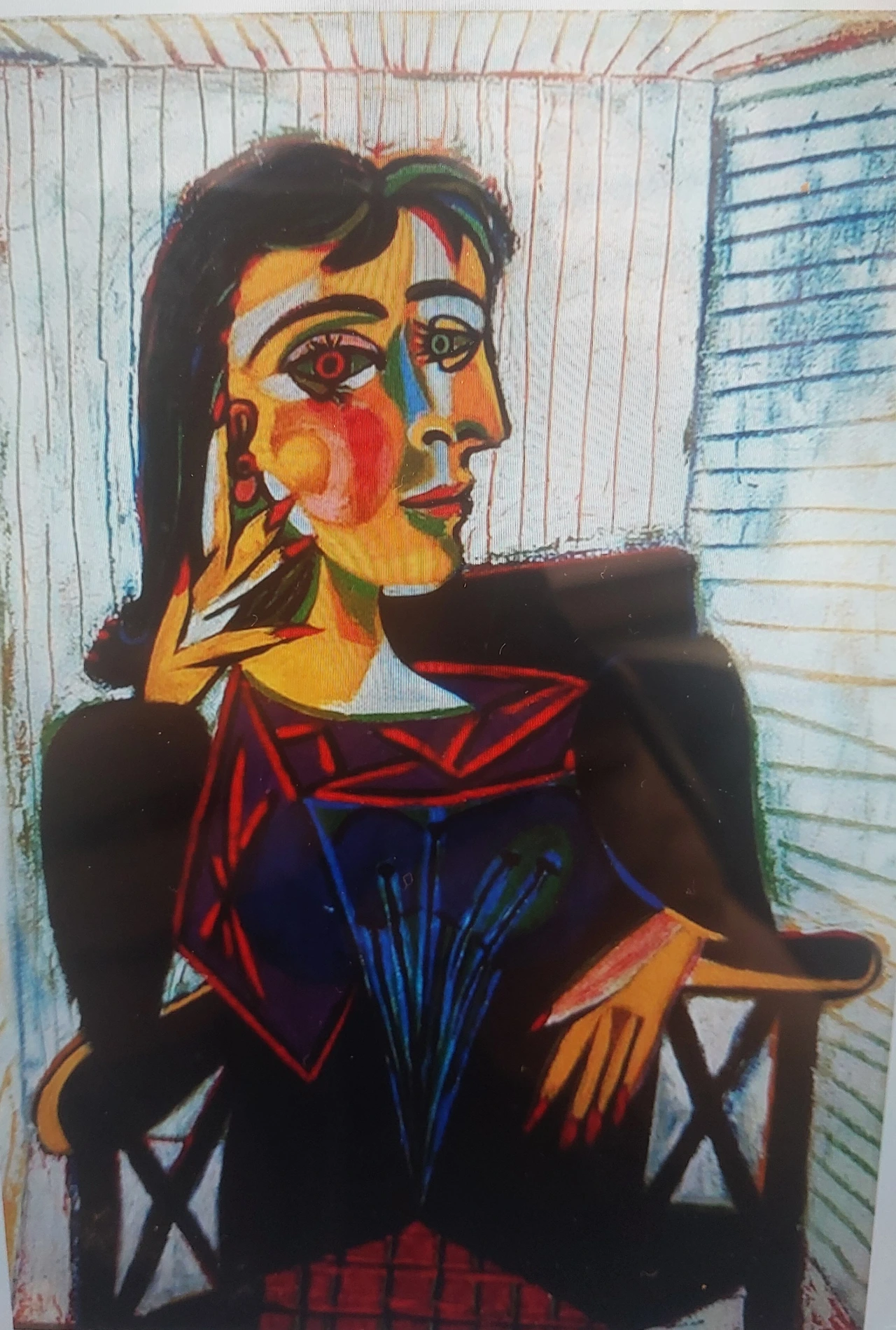 바람둥이 피카소는 도르마르를 지성과, 예술의 여인으로 극찬하였다 눈부신 아름다움으로 피카소와 늘 지적논쟁의 상대는 애인들 중에 도르마르였다 1930년-1940년대까지 9년간 피카소의 연인이며 뮤즈였다 파리의 작업실에서 "게르니카"제작과정을 도라마르가 사진으로 담아냈기 때문이었다 대표작 <게르니카>는 도라마르의 아이디어에서 나왔다 그 후 피카소의 애인중 도라마르를 그린 작품이 많은 것은 그녀의 예술성과 아이디어 때문이었다 도라마르와 사귀면서도 피카소는 테레즈와도 연인 관계였다 테레즈의 모습은 늘 온화하였고, 도라마르의 초상은 <아래사진> 신경이 곤두서있다 우는 듯 슬픈 모습의 도라마르 그림이 대부분이다 실제로 도라마르는 피카소의 여성 편력에 지쳐있었고, 정신과 치료를 받고 있었다 아래 피카소의 눈에 투영시킨 도라마르의 초상은 의자도 옷도 검은색이며 테레즈의 그림에서 밝고, 화려한 색과 대조적이다 피카소의 편력의 품질이 좋지 않은 것은 누구나 알기 때문에 생략...