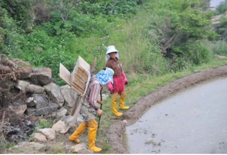 모판을 둘러멘 채 돌계단 같은 논둑을