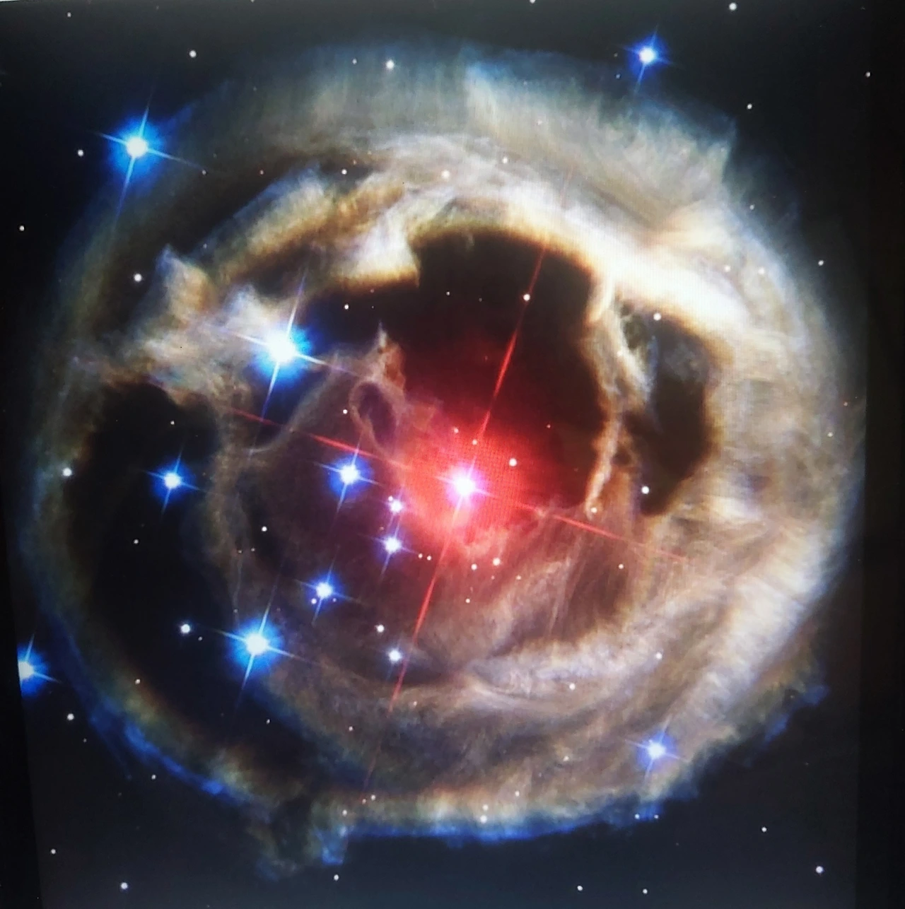 너울 거리다 반짝이는 별 고흐의 격정이여! 허블 우주 망원경 사진 속 너의 모습 담았다. 블랙 우주공간에 붉은 별은 중심에서 장렬하게 빛난다. 우주먼지 마저 흰색 갈색의 신비로움아 "외뿔소자리 2002년 v838" 폭발로 최후의 만찬이 된 별아!"별이 빛나는 고흐의 그림"은 고흐의 마음에서 소용돌이치는 별 11개를 고통스러운 심신으로 그렸다. 고흐의 슬픔을 하늘에서 보았나? 2002년 1월에 폭발한 의문의 외뿔소자리 별. "두 별"은 고흐 37세 요절한 영혼이 다시 v838로 이어저 폭발하였을까?