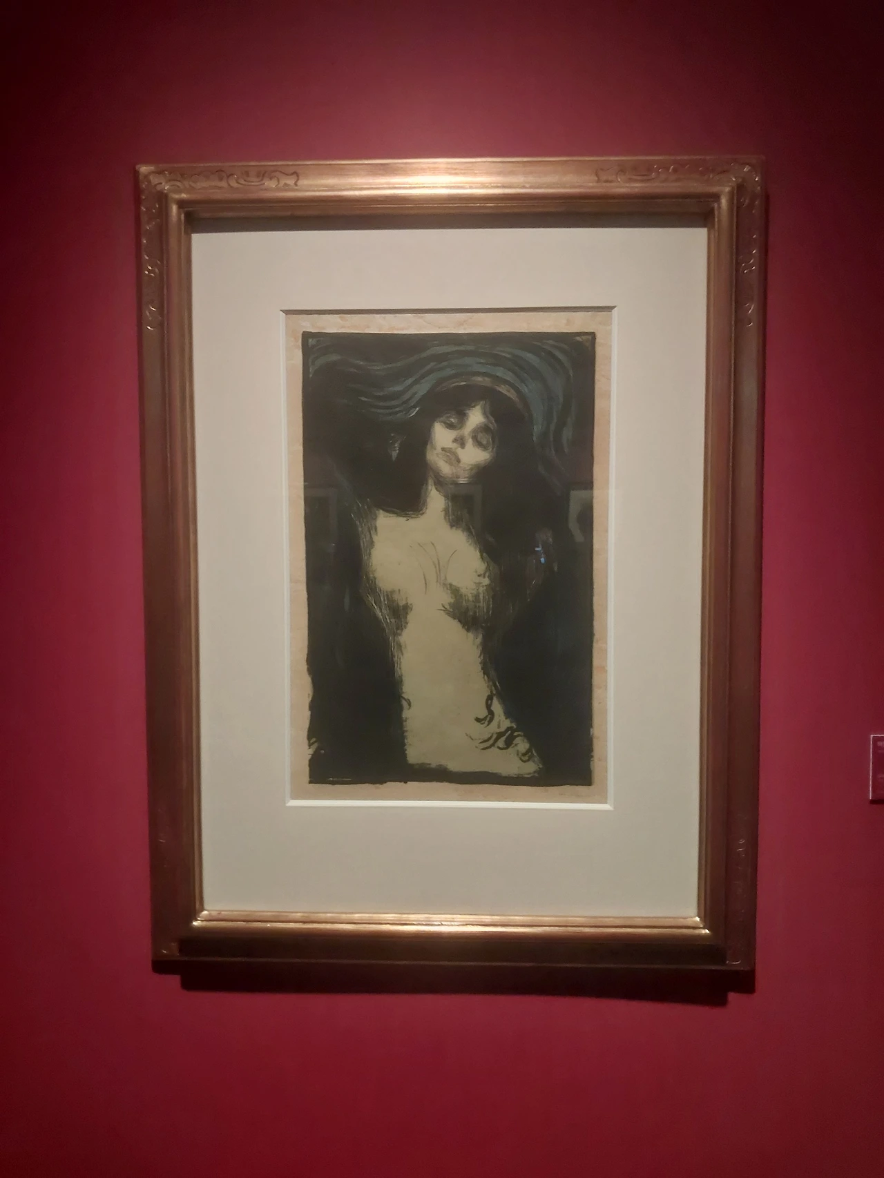 한가람 미술관에서 가슴으로 포효하는 거친 숨소리가 나에게 들려왔다. 뭉크전 140점을 보면서 뭉크의 내면의 신비로움이 그림마다 박혀있었다. 팔뼈가 보이는 뭉크의 자화상은 그의 절규의 삶이었음을 암시하고 있었다...죽음을 예감한 이별의 순간을 자화상에 담았다. 팔뼈의 자화상 완성 후 그는 삶을 불태운 절규를 완성 하며...깊은 영면으로 올리 운다. 키스하는 감미로움... 해변의 여인 <한여인은 해골 뭉크> 신비로운 해석 을 해야 하는 순간들이다. 그림마다 말을 하고 있었다. 뱀 파이어를 드디어 보았다!! 숨 막히는 진한 포도주처럼 뱀 파이어 여인은 남자의 진한 삶을 담아 목덜미에 정맥과, 동맥을 힘차게 빨아들인다. 삶은 피를 빠는 것처럼 역설적으로 뭉크의 격정적인 삶이 그림 속에서 뜨거운 전율로 내게 속삭였다. 뭉크전을 보면서 천국을 보는 듯 행복한 자신을 보았다. 마돈나의 역동적인 뒤 틀림 속에 종이에 석판 한 그림 마돈나와 마주친 순간!!! 팜므파탈이 되어 치명적인 유혹의 되어 내 눈빛에 다가왔다!....