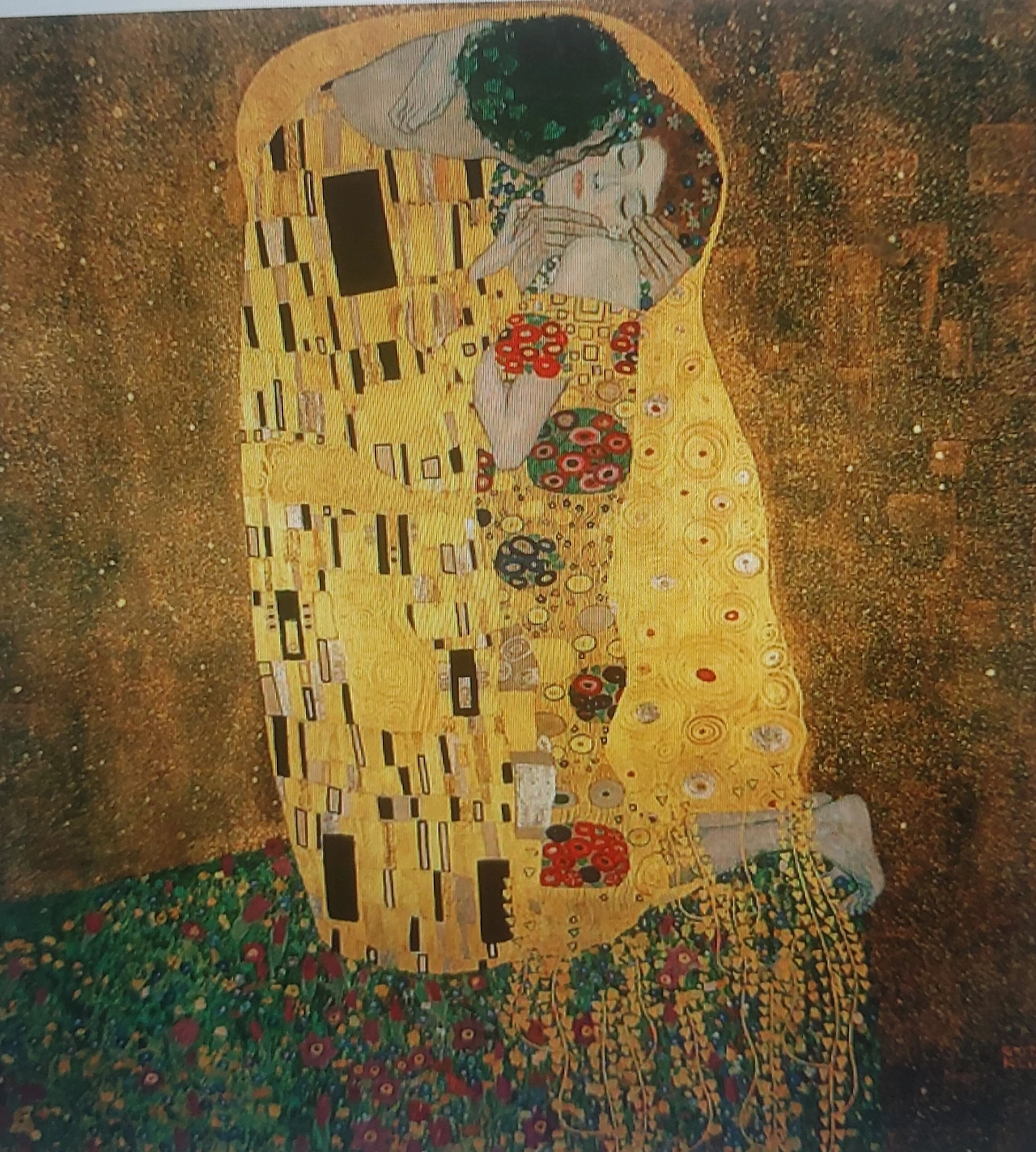 그림 바탕과 커플의 의상까지 화려한 황금빛 붓질로 순금의 색이 화려하고 따뜻하다. 얼어붙은 여인의 옷소매는 천연루비 녹색 에메랄드 보석가루로 화려한 유색보석에 매료된다.