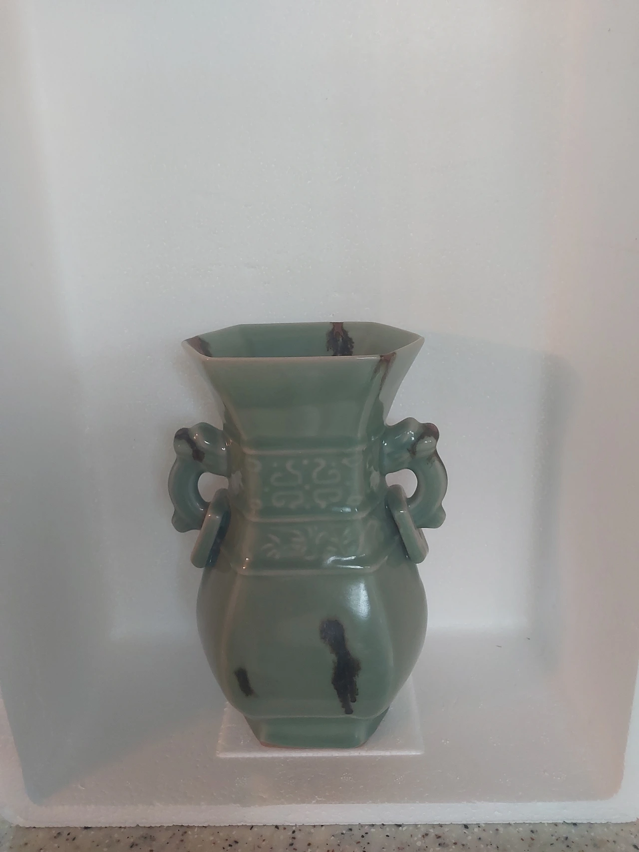철성분을 입히어 고온에 빚어낸 송나라의 철화무늬 청자이다. 일천 년의 신비를 품은 청자로 높이는 24센티로 육각형태의 도자기다.