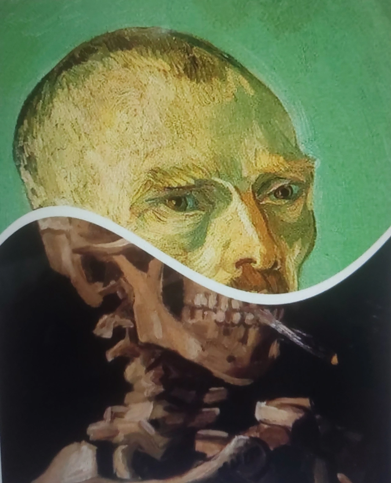 [[고흐의 자화상과, 담배 피우는 해골을 겹쳐놓았다. 1885년 5월 이후 따뜻한 식사를 한 것은 6번밗에 없던 고흐 동생 테오에게 보낸 편지다.