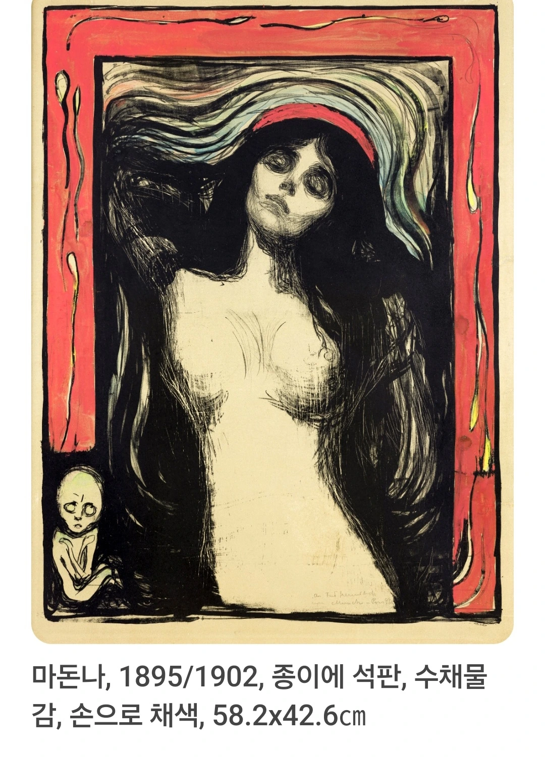 액자틀에 남성의 생식세포가 프레임을 장식하고, 쭈그려 앉아있는 태아처럼 생긴 위축된 그림이 뭉크 자신을 표현한 것일까