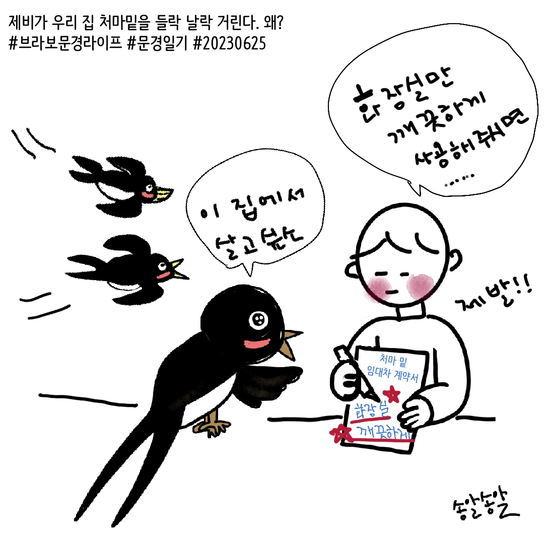 제비들이 집을 지으면 집세를 받지 않는 대신 청소를 잘해야 한다는 조건을 임대차 계약서에 넣어야겠다. 우리 집 화장실 청소도 하기 싫어 미루기 일쑤인데 제비 화장실 청소를 해야 한다니…. 너무 싫다. 제비다리를 고쳐주지 않았어도 흥부는 복을 받았을 게다. 틀림없다.