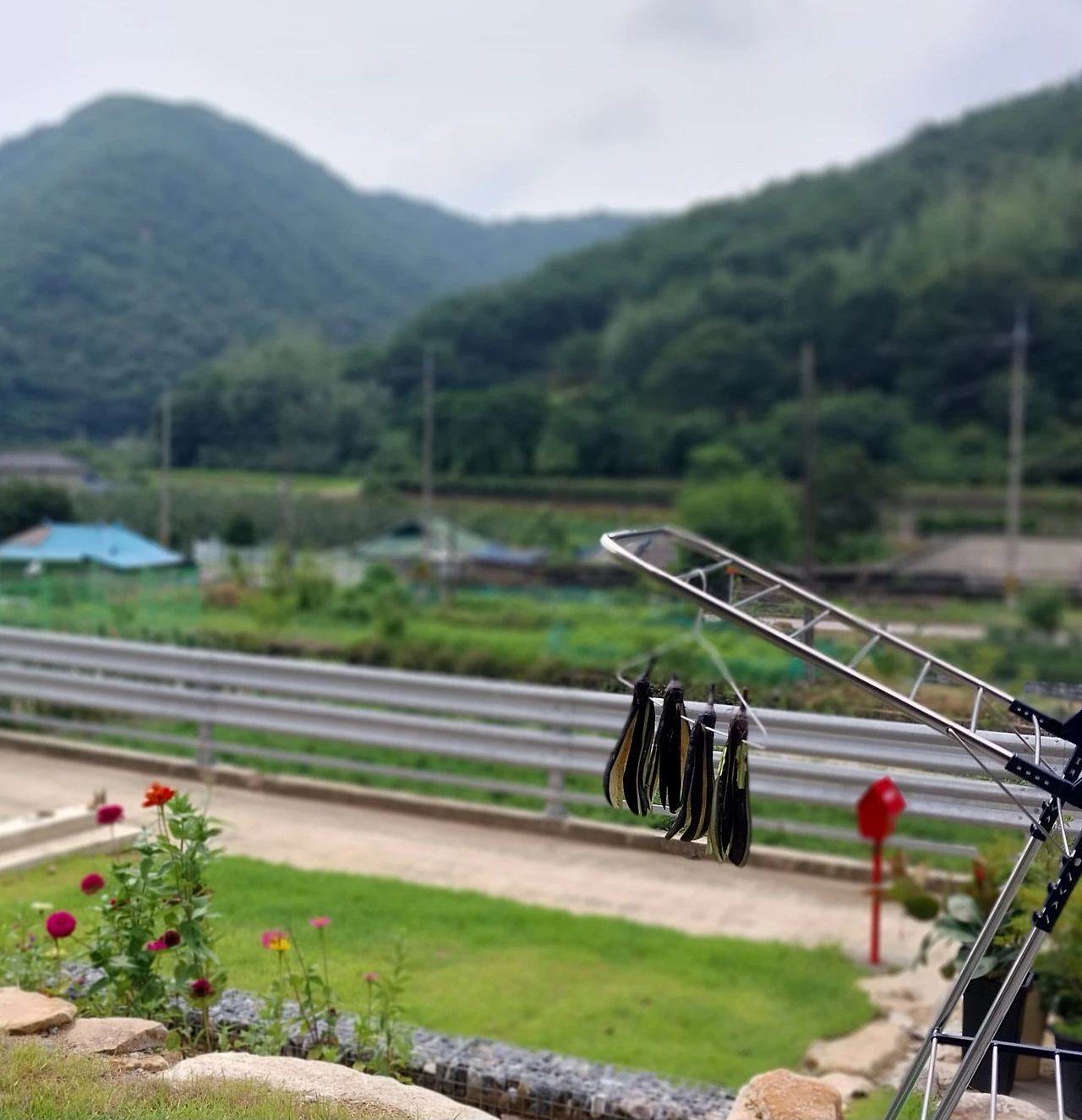 일단 말리기로 했다. 수분이 빠져 꼬들꼬들해진 마른 가지를 볶으면 낫지 않을까. 햇빛을 믿고 가지를 썰어 내놓았다. 동글동글 썰어서 채반에 말려도 되지만 나는 길쭉하게 가지를 갈라 옷걸이에 걸었다. 요즘 햇빛은 만물을 태울 듯이 뜨겁다. 하루 햇빛이면 바짝 마를 줄 알았는데 2~3일은 걸릴 것 같다. 일단 4개로 시작했는데 잘 되면 주렁주렁 달린 가지들도 다 따서 말리리라. 그리고 맛있게 먹어보리라.