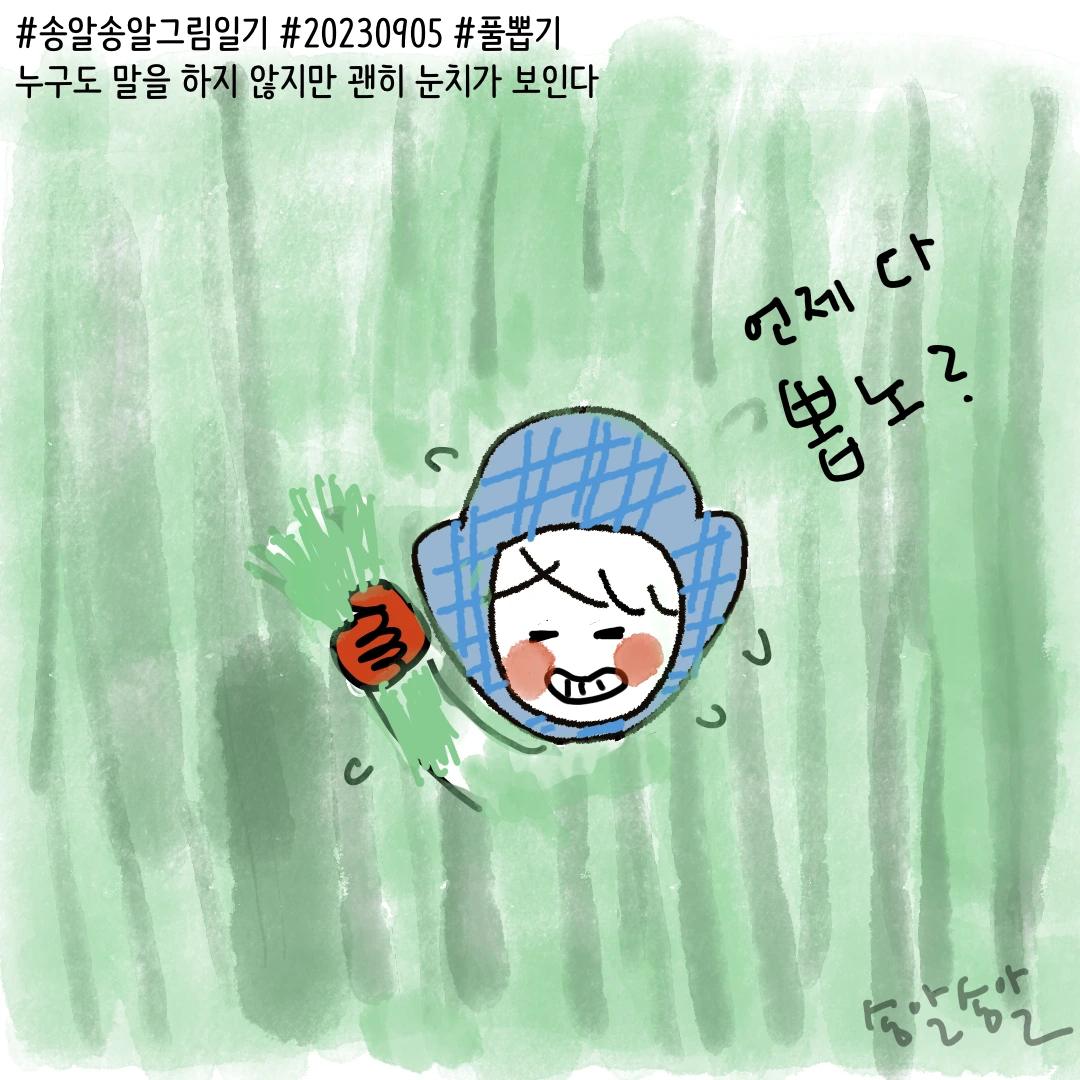 아침에 눈을 뜨자마자 풀을 뽑았다. 남편은 남의 눈치 볼 것 없다며 꿈쩍도 안 한다. 혼자서 40분쯤 했나. 땀범벅이다. 다리도 후들거리고 얼굴은 빨갛게 익었다. 나는 힘들어 쓰러질 것 같은데 티가 너무 안 난다. 하루가 지나면 내가 뽑은 자리에도 새로운 풀이 빼꼼 얼굴을 내밀 것 같다. 신경질이 났다. 내가 살다 살다, 풀에게 눈치를 볼 줄이야. 가수 나훈아 씨의 잡초라는 노래까지 미워질 판이다. 이름 모를 풀들아, 나한테 왜 그래? 이름이 있는데 불러주지 않아서 그런 거니? 정녕 풀을 그대로 두면 안 되는 겁니까? 구시렁구시렁. 내년에는 이 지경이 되지 않도록 미리미리 단속을 잘해야겠다. 구시렁구시렁.
