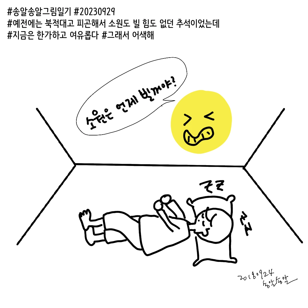 예전에는 추석 차례를 지내고 일가친척들이 돌아가시고 나면 힘이 쪽 빠져 지쳐 널브러졌다. 보름달을 보고 소원을 빌 기운도 남아있지 않았다. 달을 보려면 아파트 문을 열고 밖으로 나가야 하는데 그럴 기운이 없었다. 명절 일기를 보면 매년 비슷했다. 달은 소원을 들어주려고 기다리고 있고 나는 드르렁거리며 자느라 소원을 빌지 못했다는 푸념 어린 일기를 쓰곤 했다. 그만큼 추석은 피곤한 날이었다.