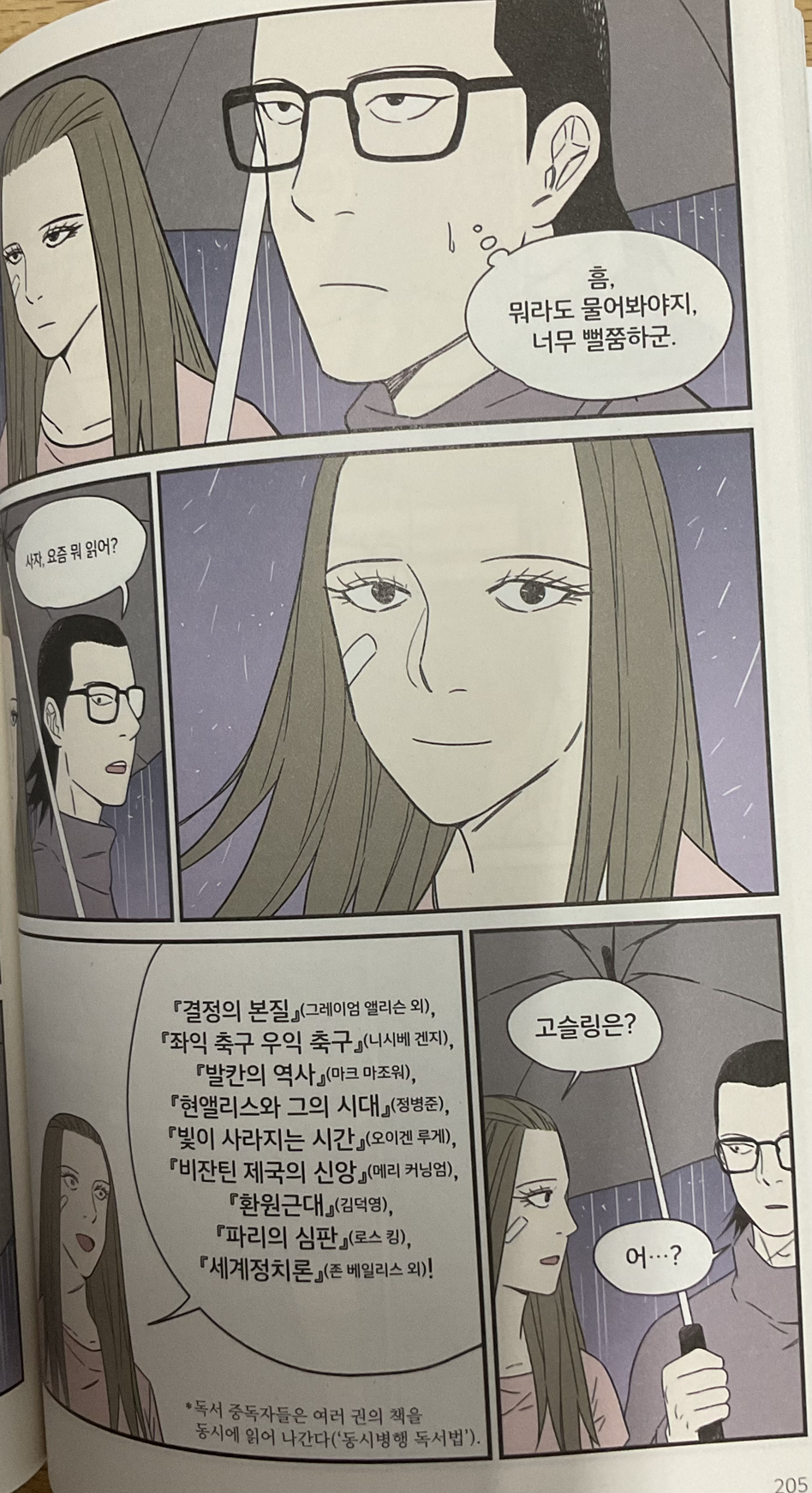 B급 감성과 초현실 개그를 표방했으니 각오했다. 중간중간 말도 안 되는 표현과 도저히 납득되지 않는 내용을 보아도 가볍게 넘어갔다. “B급이잖아” 이해하려고 애쓰지 않았다. 키득키득거리는라 애쓸 생각도 딱히 들지 않았다. 그런데 마지막 부분이 정말이지 너무나 산만했다. 왜 그런 거 있잖나. 캐붕 느낌이다. 등장인물들의 ‘캐릭터 붕괴’ 말이다. 나만 그런가? 왜 독서 클럽 회원들이 갑자기 모두들 첩보물을 찍고 있고 있을까. 이해를 하려면 2권을 읽어야 하나? 2권을 위한 밑밥인가? 아무튼 산만하다.