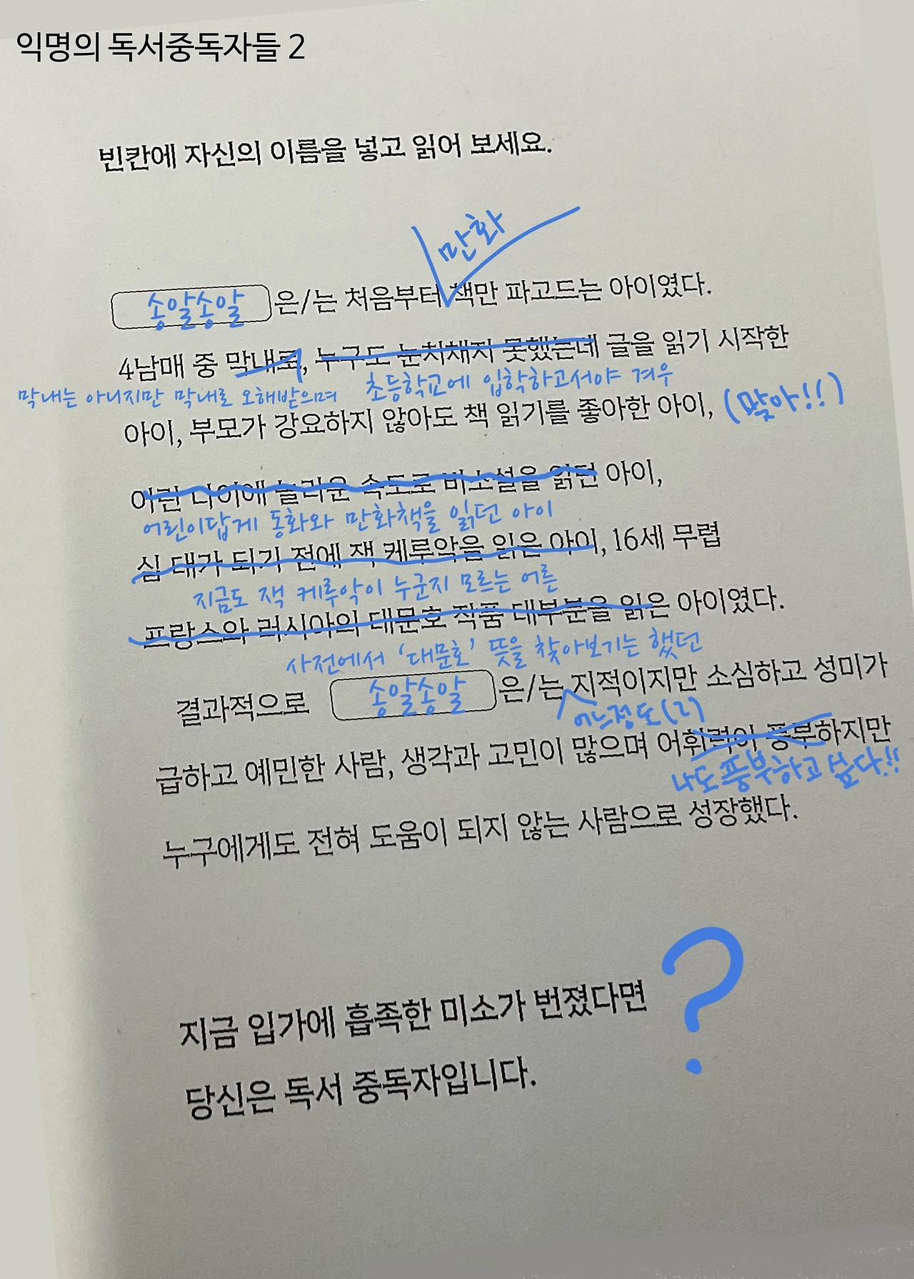 1권처럼 2권의 시작도 강렬하다. 뭐랄까. 독서중독자 자가 진단 키트 같다. ‘빈칸에 자신의 이름을 넣고 읽어 보세요.’ 이것을 안 하고 책장을 넘기면 작가에 대한 예의가 아닐 것 같다. 작가의 말대로 빈칸에 내 이름 석자, 아니 넉자를 넣고 읽기 시작했다. 어린 시절의 나는 독서 중독자와 거리가 멀다. 한글도 초등학교에 들어가서 겨우 떼었고 십 대가 도기 전에 ‘잭 케루악’을 읽기는커녕 지금도 ‘잭 케루악’이 누구인지 모른다. 부모가 강요하지 않아도 책 읽기를 좋아했으나, 그것은 심심해서였다. 바깥놀이를 좋아하지 않았던 나는 주로 집안에 있었다. 지금처럼 놀 거리가 많았으면 내가 책을 들고 있었을 것 같지 않다. 참, 만화책은 좋아했다. <캔디, 캔디 >, <베르사유의 장미> , <유리가면> , <꺼벙이> 등등을 보았다. <유리가면>은 결말을 보지 못했는데 어떻게 끝났을까?