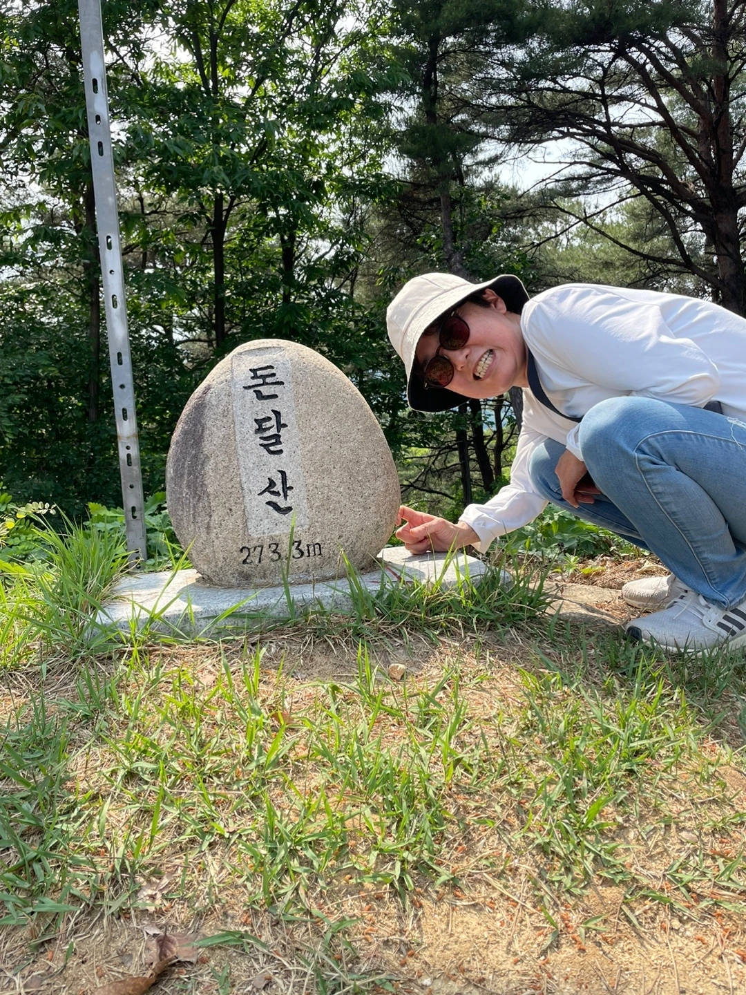 비석이 작아서 하마터면 모르고 지나칠 뻔했다. 정상 표지석의 크기는 해발 높이와 비례해서 만들도록 되어 있나? 지금껏 내가 맨눈으로 본 정상 표지석이 몇 개 되지는 않지만 거의 내 키만 했던 것 같은데 돈달산의 정상 표지석은 작아도 너무 작다. 쪼그리고 앉아 인증 사진을 찍었다. 해발 273미터의 돈달산!!!