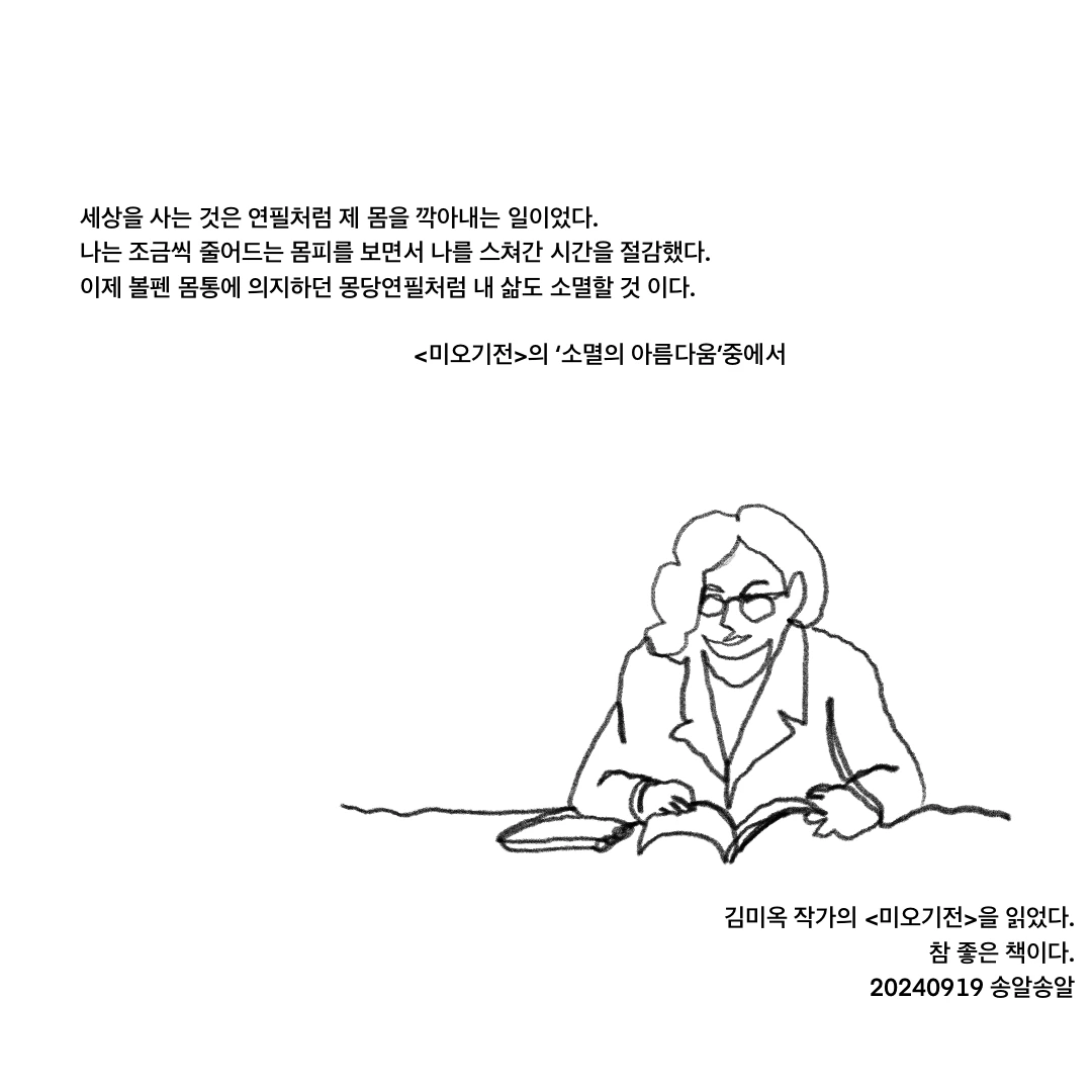 아웅 어쩌면 좋아. <미오기전>이 너무너무 좋다. 재미있지만 슬프고, 따뜻하지만 시리고, 다정하지만 아린 글이다. 김미옥 작가님에게 홀딱 빠졌다. 웃다가 눈물이 또로록 흘러내린다. 웃다가 울다가 XXX에 털 날까 걱정될 정도이다. 분명 고단했던 일, 고통스러운 기억, 슬픈 추억, 아팠던 결핍, 비참했던 과거를 이야기하고 있는데 작가의 유머에 빠져 나도 모르게 웃는다. 큭큭거리며 웃다가 가슴에 콕 박히는 뭔가에 눈가는 촉촉해지고 코끝이 시큰해진다.