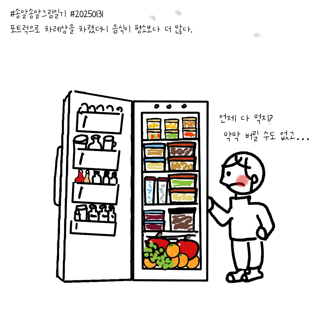 다른 거 먹고 싶은데 아직도 냉장고는 꽉 차있다.