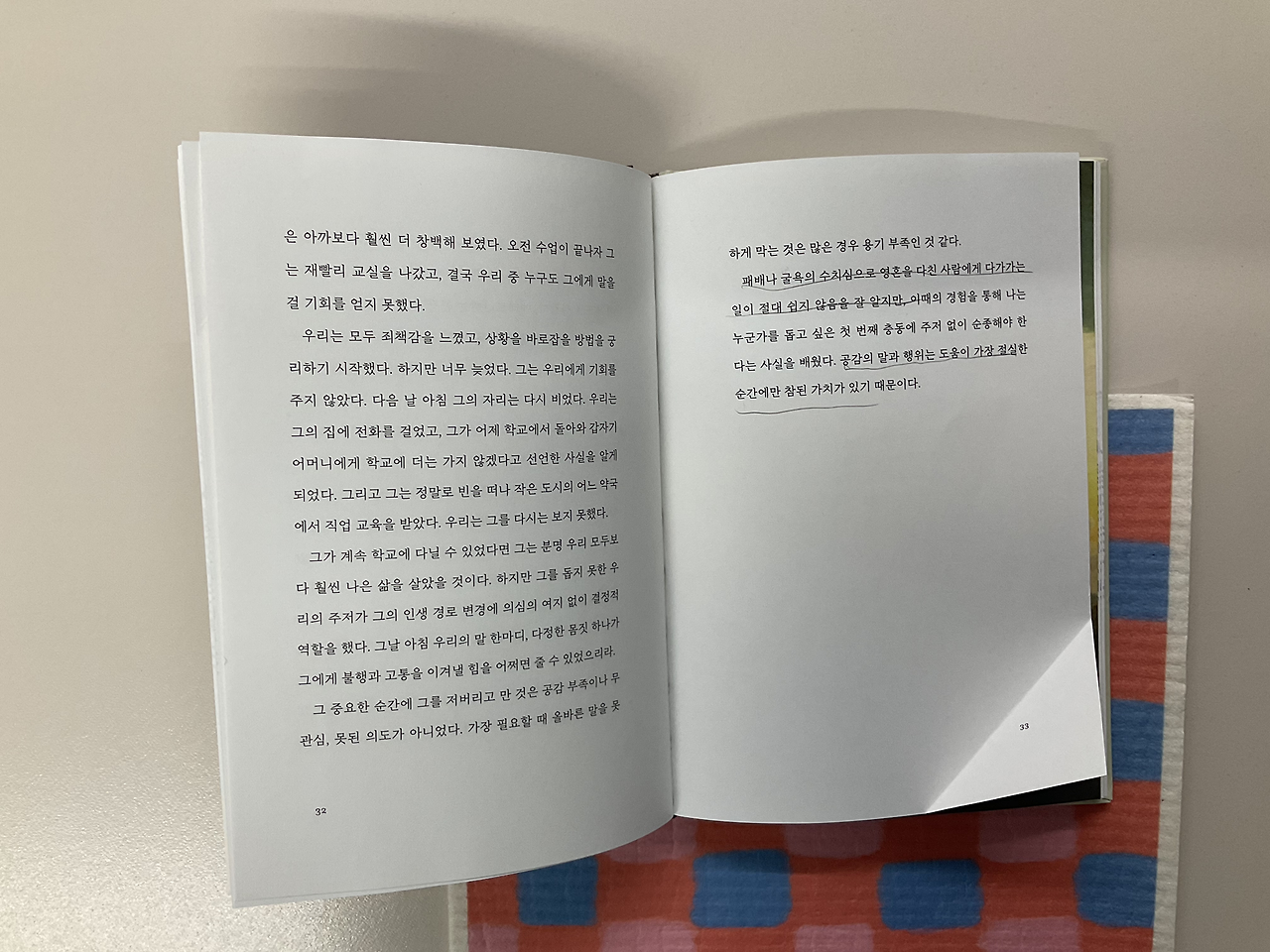 이럴수가. 책을 읽기 시작하고 곧 기분이 나빠졌다. 어떤 이가 책에 줄을 좍좍 그어 놓았다. 모서리를 접어 놓은 쪽도 제법 있다. 마음을 울리는 문장을 만났을 때 밑줄을 긋고 별표를 하고 돼지 꼬리를 그려 강조하고 싶은 마음은 이해한다. 자신이 ‘산‘ 책에 해야 한다. 빌린 책은 깨끗이 보아야 한다. 책 모서리는 왜 접어 놓은 건가. 포스트잇이라는 괜찮은 도구가 있는데 말이다. 대출 예약을 하며 느꼈던 내적 친밀감은 취소다. 낙서도 없고 여백에 자신의 생각이나 느낌을 써 놓지 않은 것을 그나마 다행이라고 해야 하나. 책을 읽고 싶은 마음이 달아난다. 제발요. 도서관 책은 깨끗하게 봅시다요. 도서관 책은 우리 모두가 함께 보는 공공재산입니다.