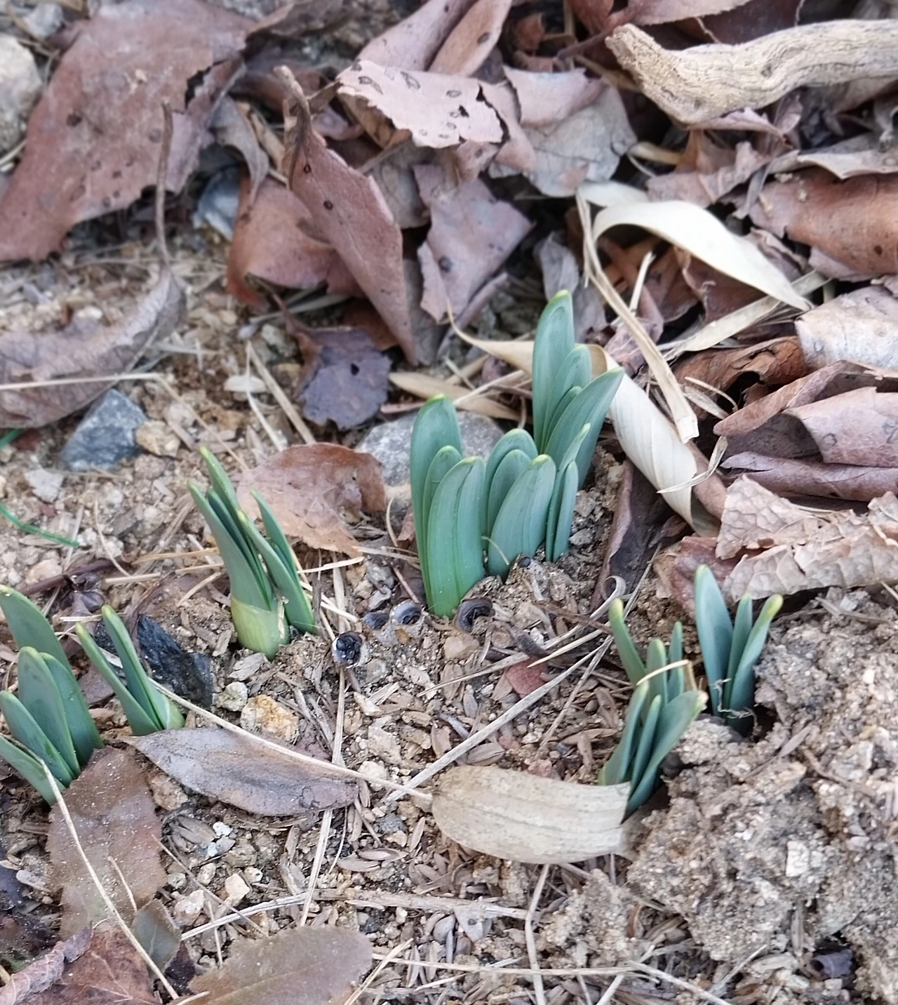 꽃밭에 수선화와 튤립 새싹이 뾰족이 얼굴을 내밀었다.