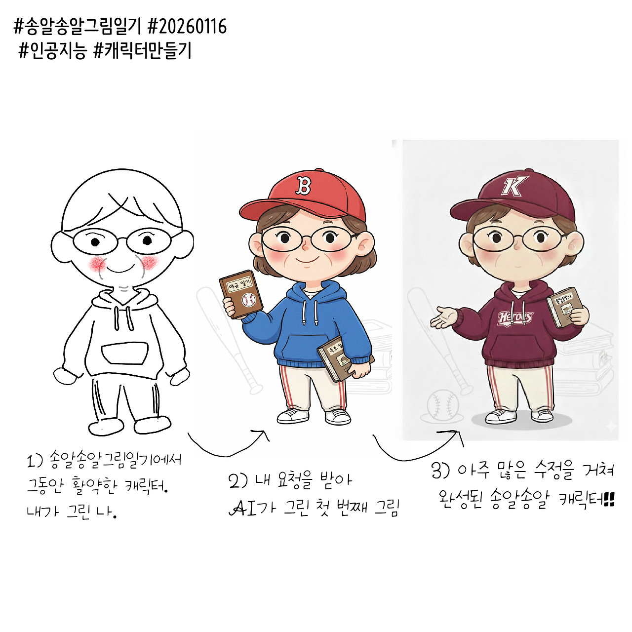 ”나는 야구와 독서를 좋아하는 50대 여자야. 내가 그린 내 캐릭터를 기본으로 캐릭터를 업그레이드시켜, 앞으로 야구일기와 독서일기에 사용하려고 해. 도와줘 “