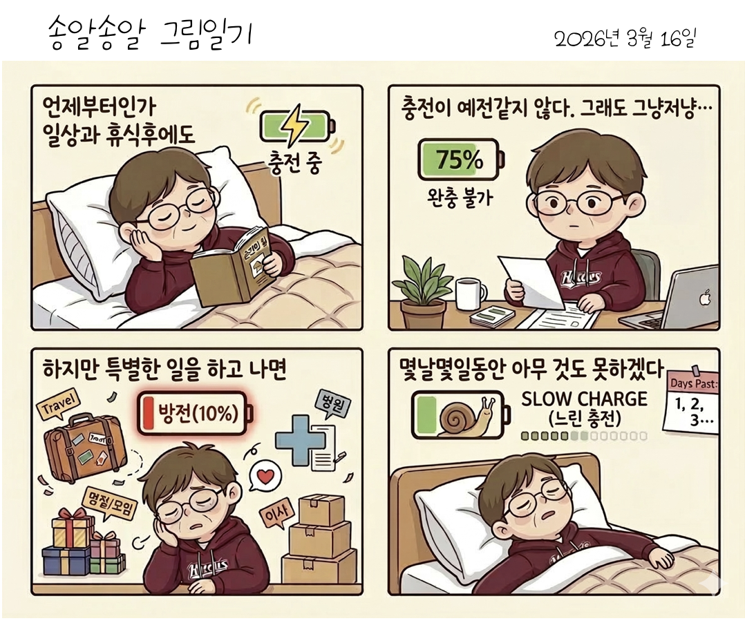 가끔 집들이, 모임, 여행, 이사, 병원 방문 같은 특별한 일이 생기면 상황이 달라진다. 몇 날며칠을 재충전에 시간과 공을 들여야 아주 천천히 일상을 회복한다. 그야말로 저속충전이고 100% 완충은 이제는 그림의 떡이다. 문제는 충전시간이 점점 더 길어진다는 것이다. 오래된 아이패드처럼 나도 낡아서 그런가?