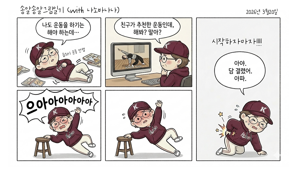 골반이 돌려지지 않는다. 어깨도 꿈쩍도 안 하고 아프기만 하다. 시작하자마자 담 결린 것 같다. 아프다. 아픈데 더 이상 하면 안 된다. 그렇지 않은가? 참말로 운동은 너무 힘들다.