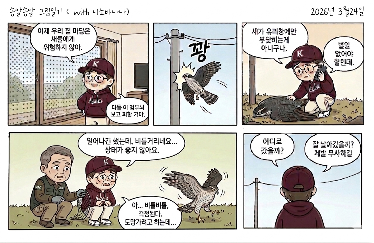 이제 새들과 평화롭게 지낼 일만 남았다고 생각했는데, 오늘 놀라운 일이 벌어졌다. 제법 덩치가 큰 새 한 마리가 뒷마당의 기둥에 부딪혀 바닥으로 떨어진 것이다. 투명한 유리창도 아닌 기둥에 부딪히는 모습을 보니 처음에는 어이가 없었다. "새 맞나? 날개는 장식인가?" 싶었지만, 그 마음도 잠시, 바닥에 쓰러져 버둥거리는 새를 보니 걱정이 앞섰다. 날개가 부러진 건 아닐까, 정신을 차리게 물이라도 뿌려야 하나, 혹시 죽으면 어떡하나, 온갖 생각이 교차했다.
