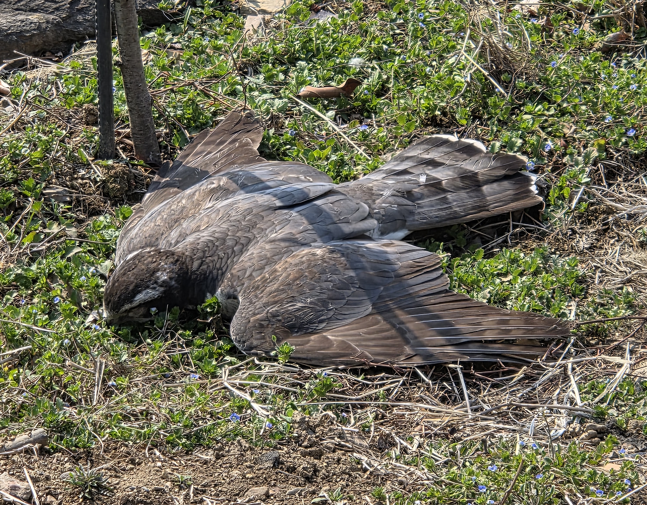 겁이 나서 가까이 가지는 못하고 멀찍이 살펴보니, 이름은 몰라도 예사 새는 아닌 듯했다. 서둘러 시청 야생동물 보호 부서에 구조 요청을 했다. 구조대를 기다리는 동안 배를 보이고 누워 있던 새는 스스로 몸을 뒤집어 자리를 잡고 앉았다. 하지만 가만히 앉아 있을 뿐, 날아갈 기미는 보이지 않았다. 30분 뒤 도착한 구조사가 다가가자 새는 비틀거리며 어디론가 도망쳐 버렸다.