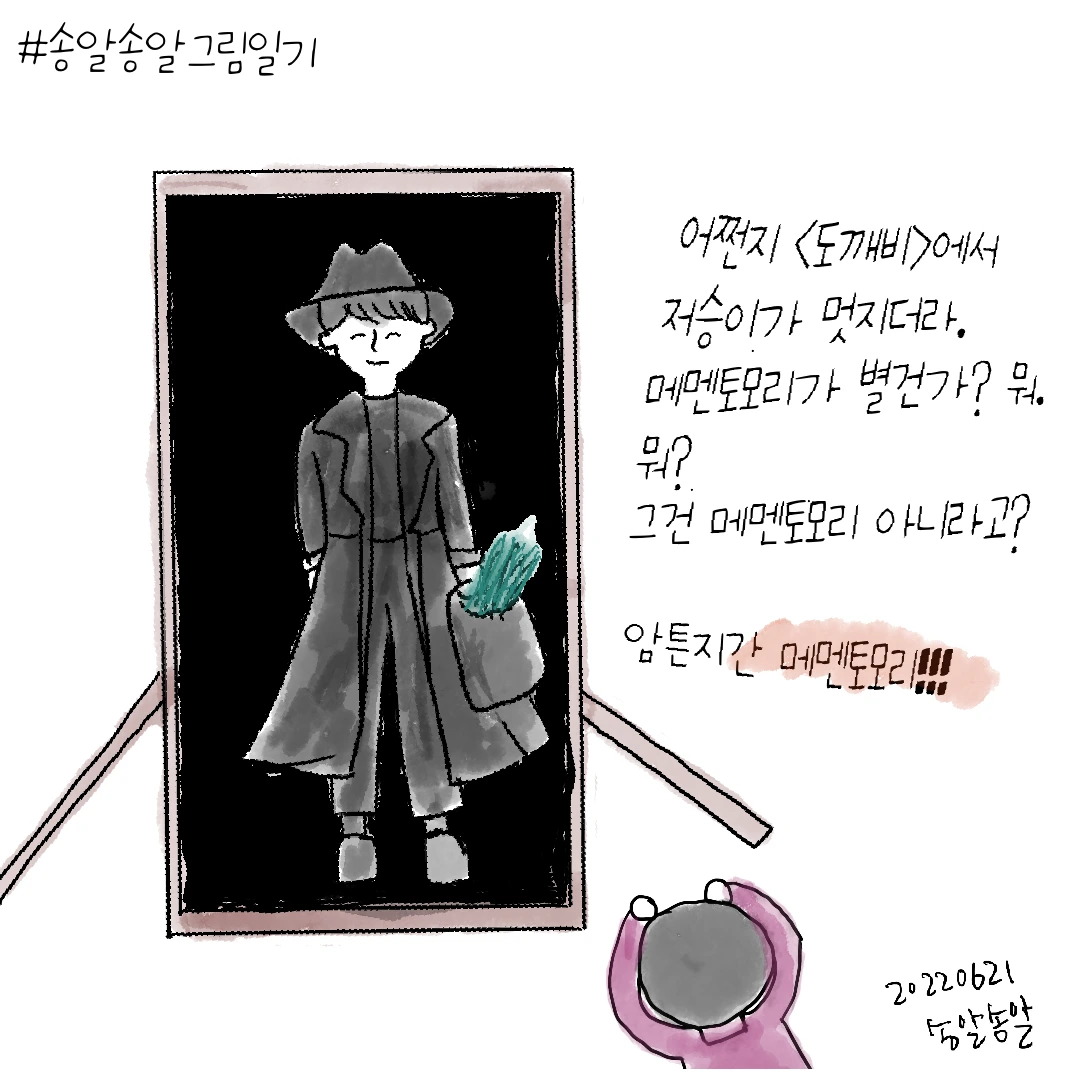“그런 마음이 메멘토 모리인 거지? 죽음을 기억하라는 것은 지금 이 순간을 충실히 살아야 한다는 의미잖아. 그런데 왜 나는 인간은 모두 언젠가는 죽을 건데 아등바등 살 필요가 있나 싶고 될 대로 되라는 마음이 먼저 들까? 그렇다고 언제 죽을지도 모르는데 막 살 수도 없고 말이야.”