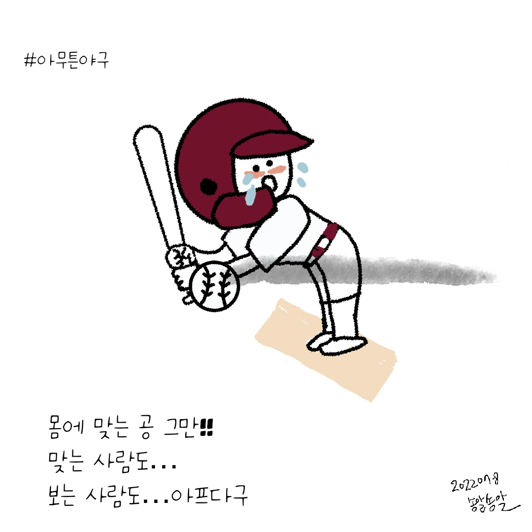 7월 7일 키움과 두산의 경기에서는 키움의 애플러 선수가 사사구를 남발했다. 비가 오락가락하는 날씨 탓인가? 양 팀 투수들의 제구가 왜 이럴까. 이틀 동안 몸에 공을 맞은 선수들의 많이 아프지 않았으면 좋겠다. 투수들은 타자를 맞출 각오를 하고 몸쪽공을 던진다고 한다. 몸쪽공을 던지지 못하면 투수로서 성공하기 힘들다는 말이 있다. 이해는 되지만 그래도 몸에 맞는 공은 싫다. 몸에 맞을 때 나는 소리에 소름이 돋는다. 빨갛게 부어 오른 상처에 마음이 아프다. 심각한 부상이 될까 겁난다. 몸에 맞는 공은 보고 싶지 않다. 타자들도 피할 수 있으면 피하고 투수들은 몸쪽공을 던지고 싶으면 칼 제구로 던지라고. 제발, 쫌!! 보는 사람도 아프다.