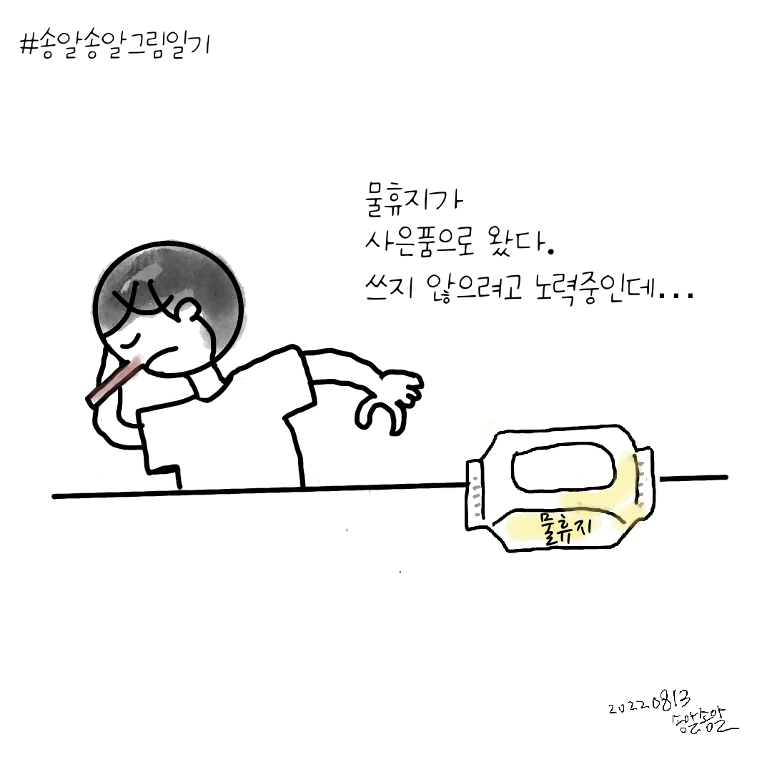 미세 플라스틱 - 놀랍고 두렵다. 어떻게 하면 줄일 수 있을까? 일단 물휴지를 사용하지 않기로 했다. 물휴지 없이 살아온 날이 더 많은데 못할 것도 없지 않은가. 다짐하고 실천에 옮긴 지 채 1년이 되지 않았지만 나름 잘 지키고 있다고 생각한다. 외출했을 때 부득이한 경우에는 가끔 사용했지만 말이다. 처음에는 마트에서 계산할 때마다 갈등했다. 살까? 말아? 왜 물휴지는 계산대 근처에 진열해놓을까? 지금은 물휴지는 쳐다보지 않는다. 그런데 물휴지가 사은품으로 왔다. 100매들이 1팩. 거부하지 못했다. 아니다 거부하지 않는 건가. 아니면 은근히 반겼을지도 모르겠다. 에구… 어쩌나. 나처럼 의지가 약한 사람은 눈에 안 보여야 안 쓸 텐데 말이다.