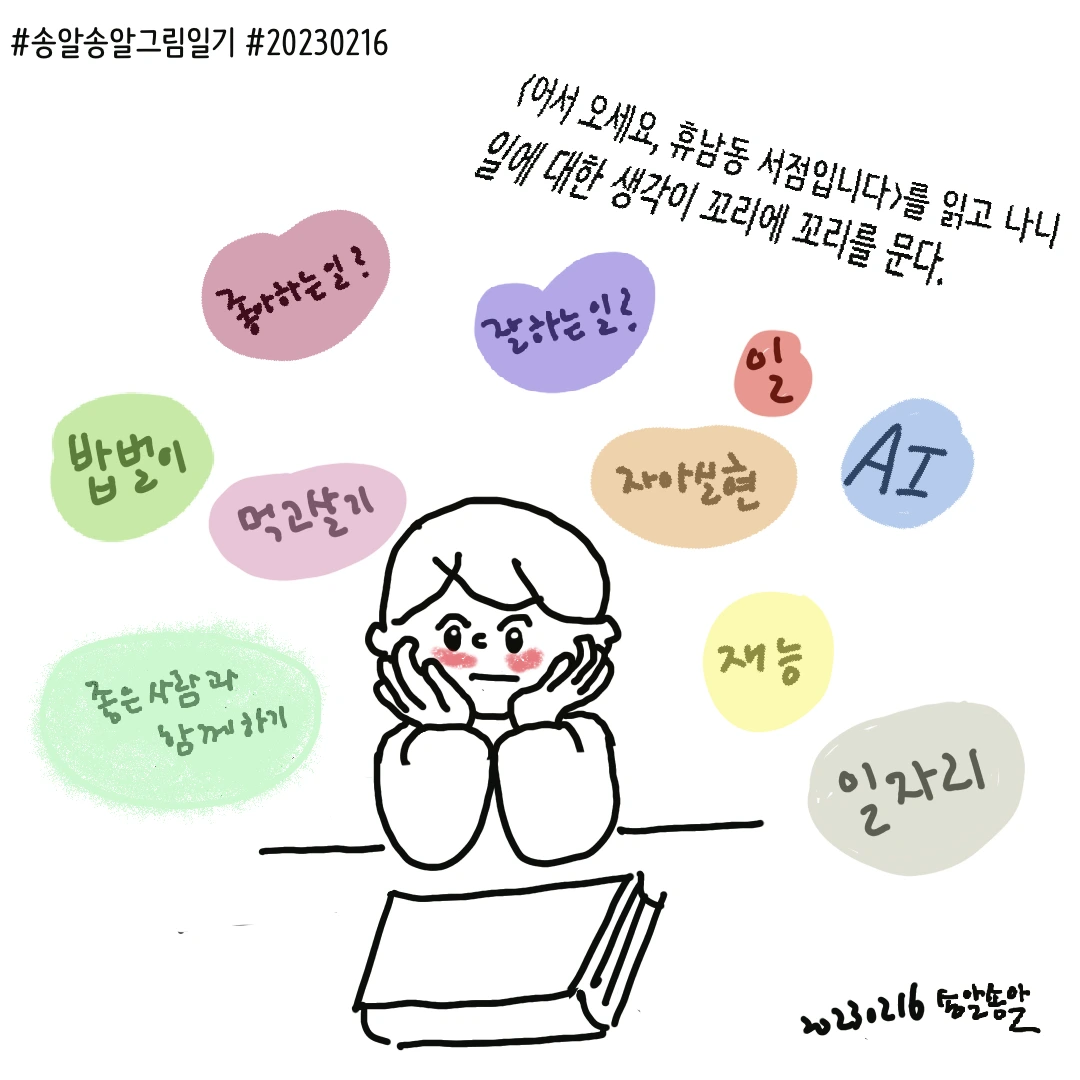 일이란 무엇일까? 우리는 왜 일을 해야 하나? 잘하는 일을 해야 하나. 좋아하는 일을 해야 하나. 일을 하면 행복하나? 일을 하지 않으면 게으른 사람인가. 인간이 하는 많은 일들이 AI로 대체된 미래에는 인간이 일을 안 해도 살 수 있을까? <어서 오세요, 휴남동 서점입니다>을 읽고 나니 일에 대한 별별 생각이 꼬리를 문다.