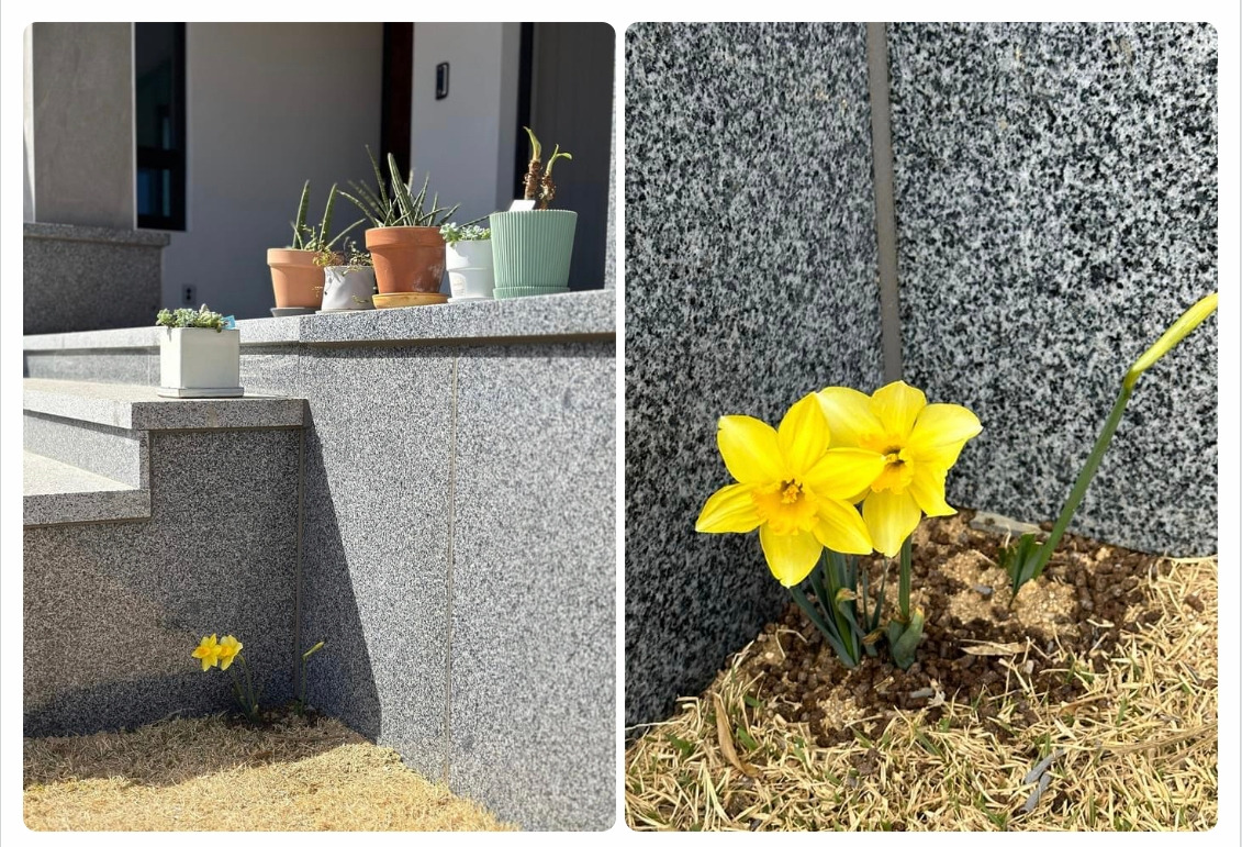 노심초사하고 있는 중에 마당 구석에 수선화가 피었다. 노오란 꽃이 참 예쁘다. 수선화가 건네는 봄인사는 예상하지 못했던 거라 더 반가웠다. 작년 겨울 집짓기 공사가 끝나고 마당 정리를 할때 시매부께서 수선화 알뿌리를 마당 구석구석에 심었다고 한다. 마당 어디에서 싹을 틔우고 꽃이 필지 모른다. 오늘도 새로운 수선화 싹이 고개를 내밀었다. 마치 보물찾기 하는 기분이 든다. 내일은 어디에서 새싹이 올라오고 꽃이 필까?