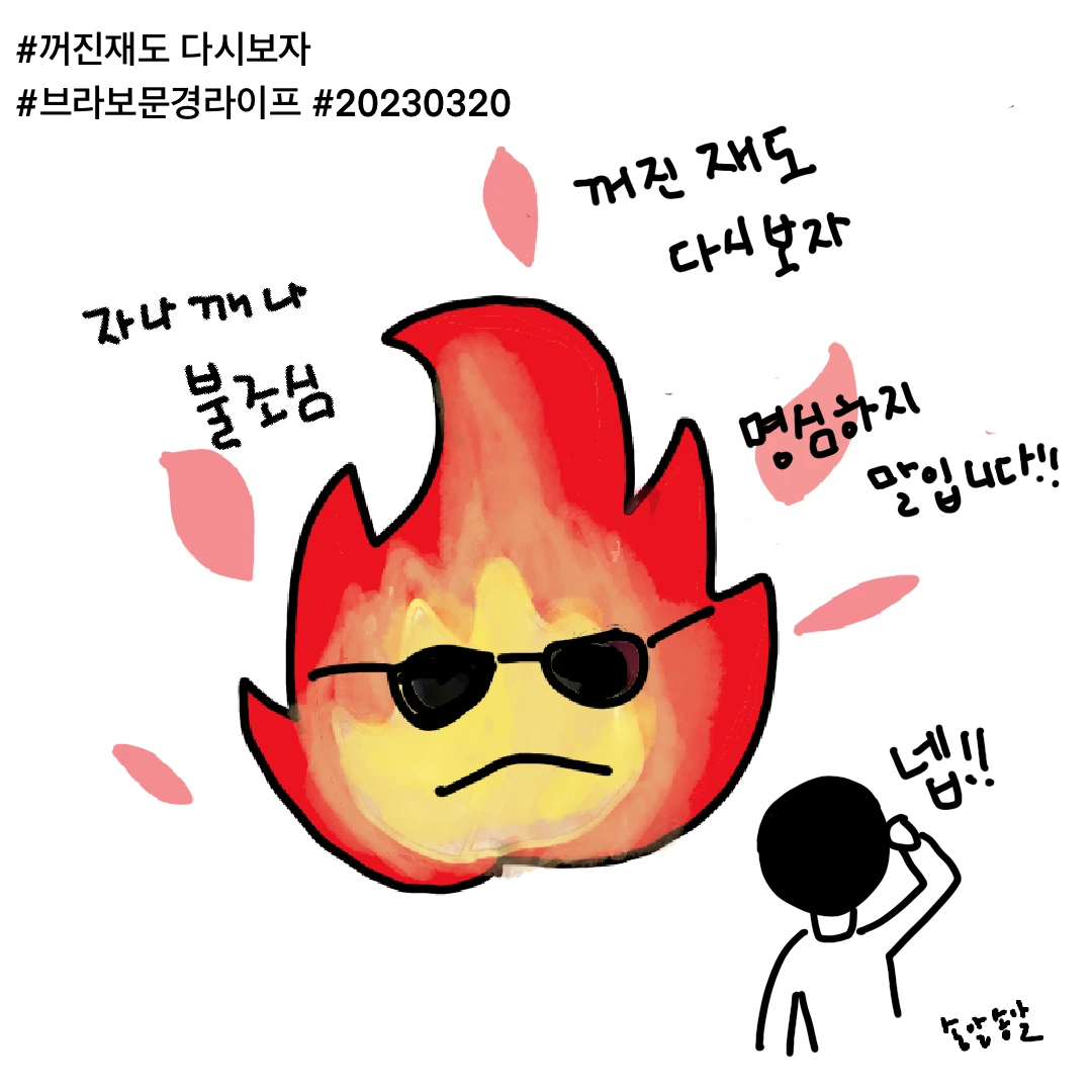 내가 어렸을 때부터 귀가 아프도록 들은 표어이다. ‘꺼진 불도 다시 보자 ’는 말의 의미를 다시금 뼈저리게 깨달았다. 꺼졌다고 생각해도, 꺼진 것처럼 보여도 불씨는 살아 있을 수 있다. 분명히 다 타고 남은 재였고, 불씨가 전혀 보이지 않았는데도 그렇게 쉽게 불이 붙을 줄이야. 아이고야.