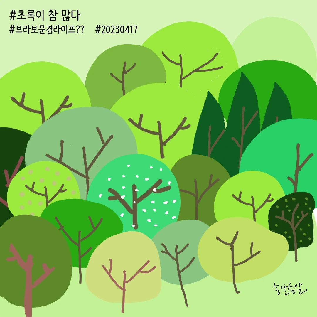 봄이 깊어지고 날이 더워지만 숲은 진초록색으로 통일된다. 그때의 초록보다 지금의 초록이 더 예쁘다. 연두색이 주는 편안함이 좋고 다양한 초록색이 사이좋게 어우러진 것 같아 기분도 좋고 눈도 맑아지는 기분이다. 초록이 참 좋다.