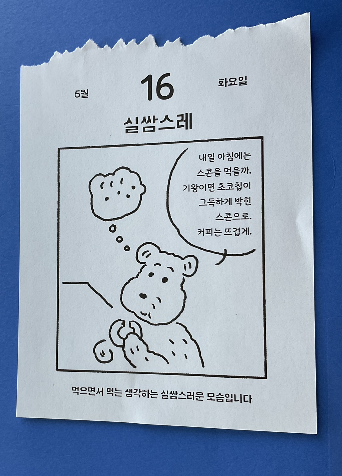 상반되는 느낌의 두 가지 뜻이 있다. 똑같은 행동도 누구는 부지런하게, 다른 누구는 부산하게 볼 수 도 있다. 일력 속의 강아지는 도넛을 먹으며 미소 지고 있다. 먹고 있는 도넛이 맛있어서 웃나? 아니면 도넛의 맛은 별로지만 내일 아침 먹으려고 하는 초코칩이 그득하게 박힌 스콘을 생각하며 웃고 있나? ‘실쌈스레’에 긍정과 부정의 의미가 다 있으니 별별 생각이 떠오른다. 갑자기 나도 스콘 먹고 싶다. 플레인 스콘에 딸기잼 발라 먹으면 얼마나 맛있게요? 아는 사람은 다 안다.