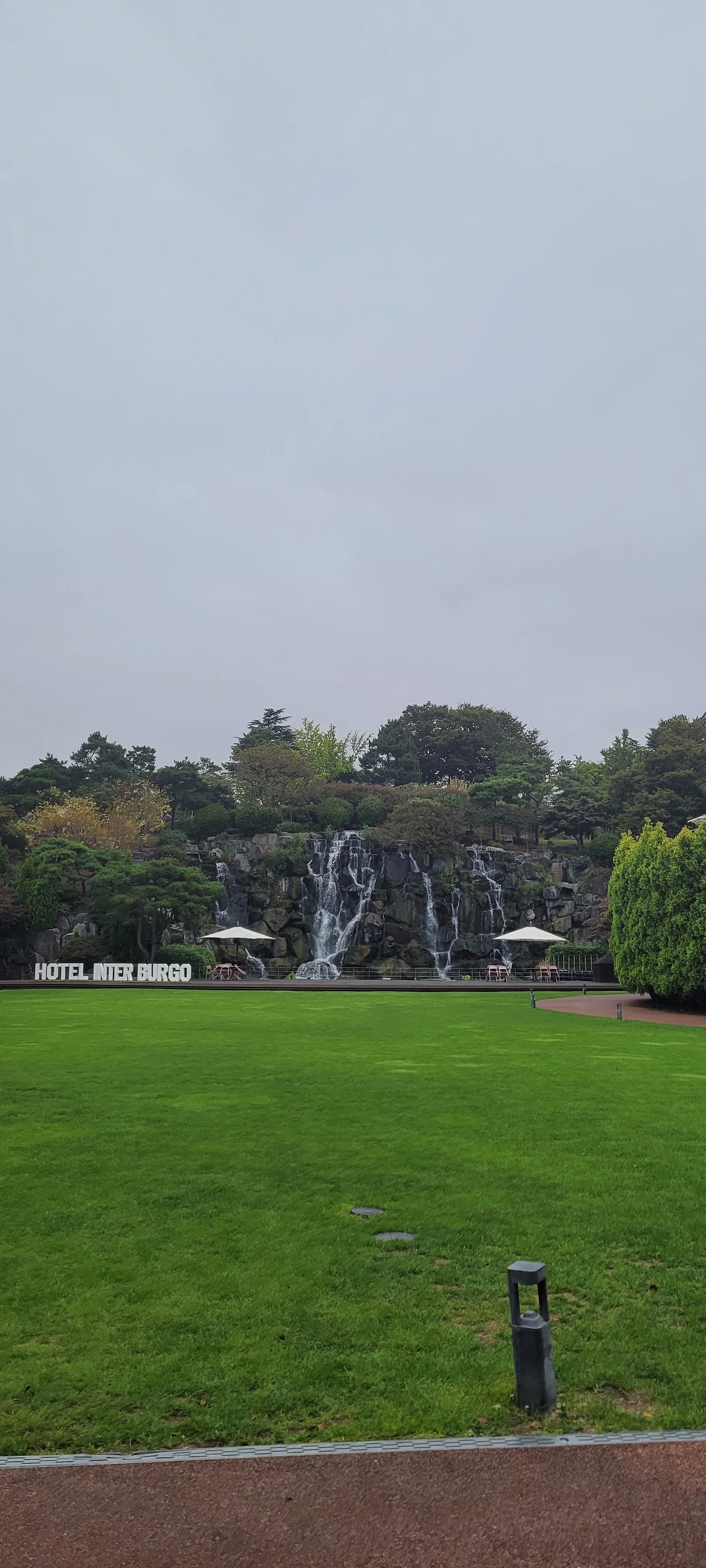 잘 가꾸어진 정원과 인공 폭포수를 배경 삼아 사진을 찍고 다음 여행을 기약하며,