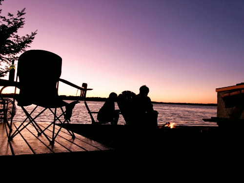모닥불 앞에서 석양 물결을 바라보고