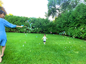 아이들은 비눗방울 잡으려 손을 뻗는다.